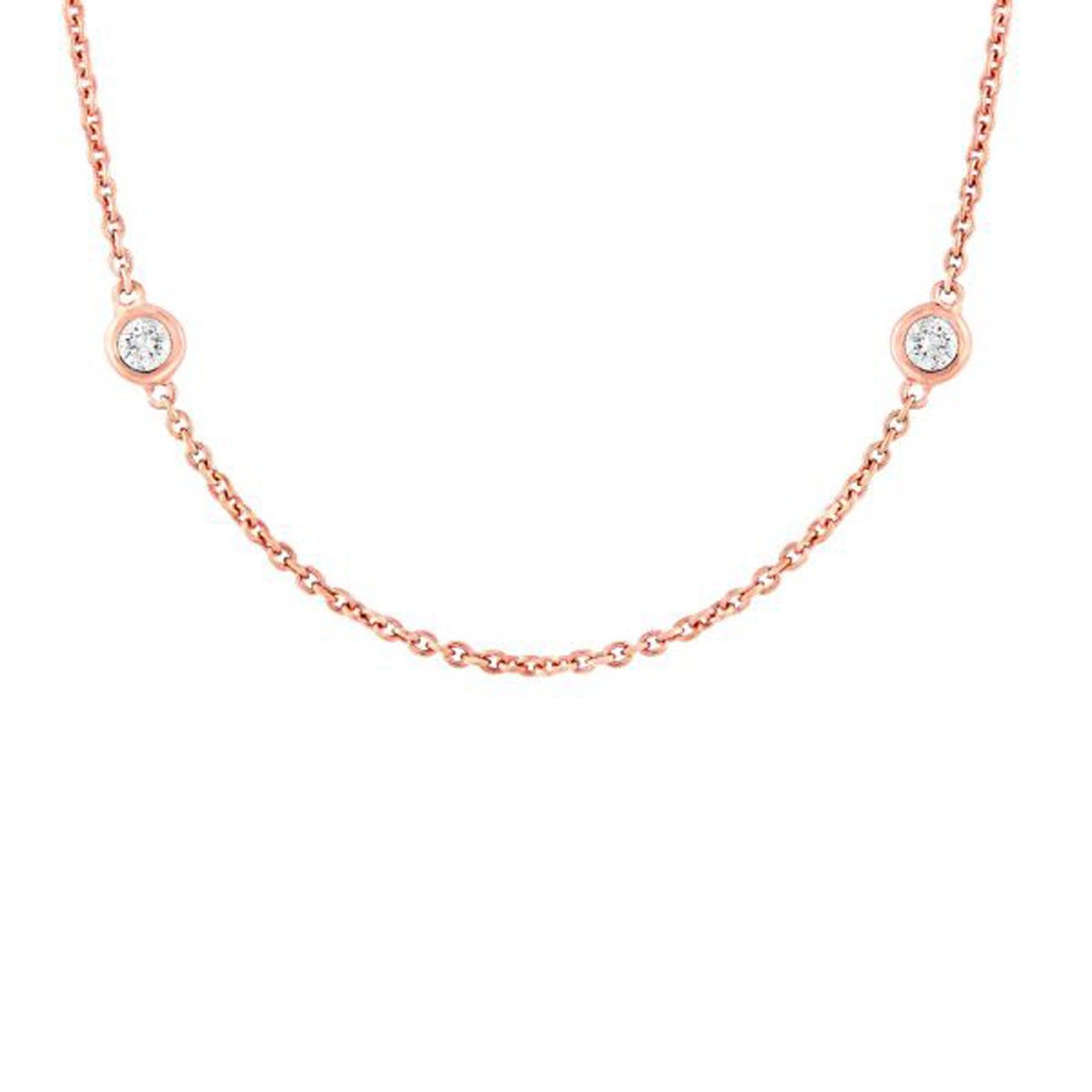 Crafted in precious 14K rose gold, this dainty chain design features a sparkling 1/4 carat of bezel-set diamonds along the chain.