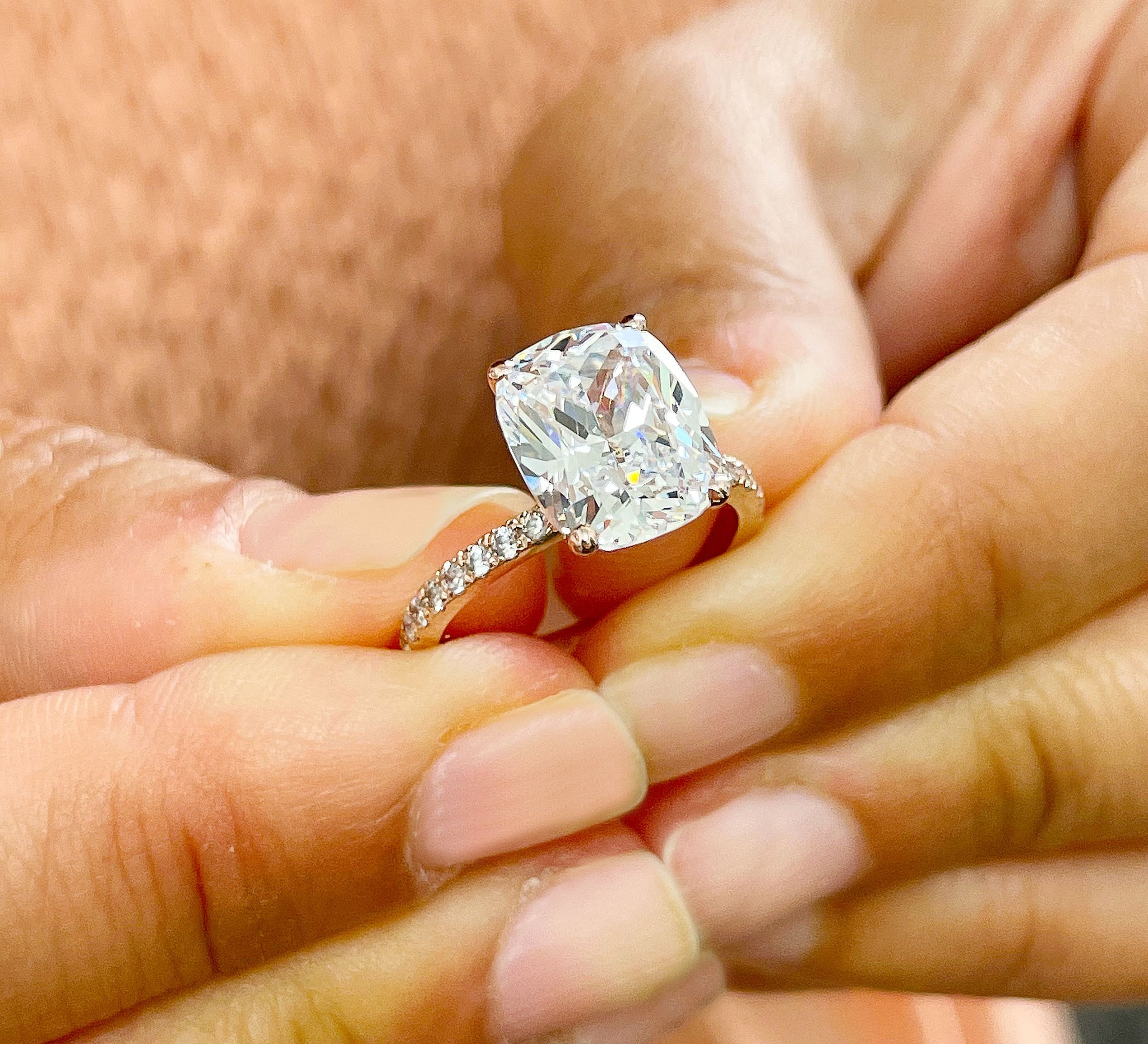 Center Stone Color: F-G, pure colorless shades up to six grades whiter than conventional moissanite. With 10 percent more brilliance than diamond explodes with light and shine.