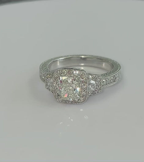 14k Solid White Gold Cushion Cut Forever One Moissanite and Natural Round And Trapezoids Diamond Engagement Ring Halo 2.00ctw