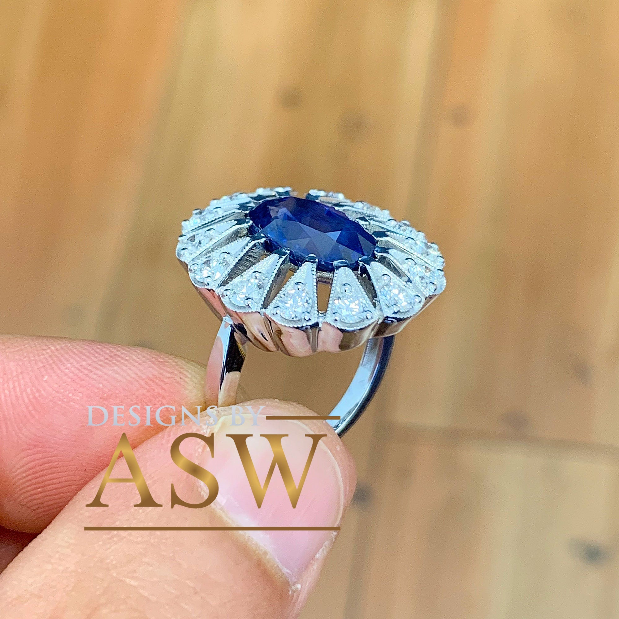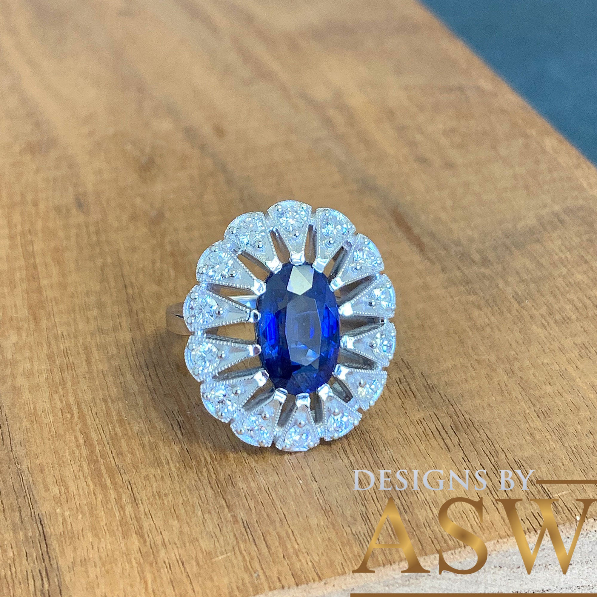 A gorgeous design with a stunning oval cut blue sapphire set in a beautiful halo filigree design, this ring definitely catches the eye!