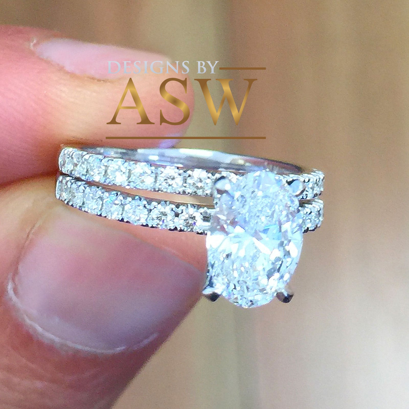 14K WHITE GOLD, 2.30CTW OVAL MOISSANITE & ROUND CUT DIAMONDS, PRONG & PAVE SET ENGAGEMENT RING AND BAND