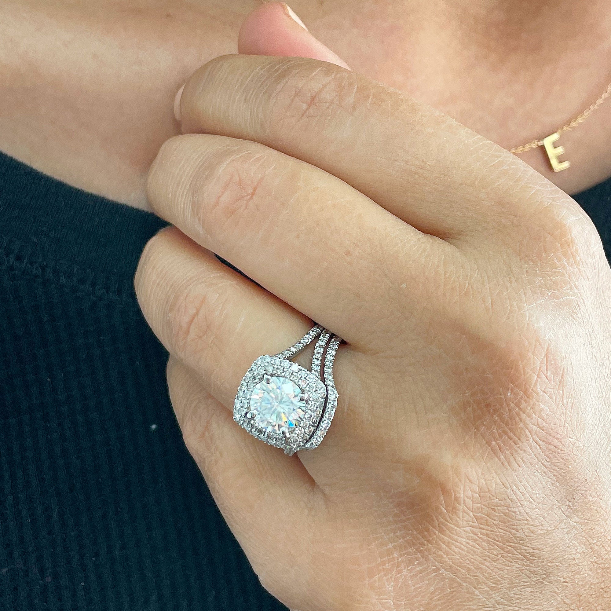14K WHITE GOLD, 3.25CTW ROUND MOISSANITE & ROUND CUT NATURAL DIAMONDS, DOUBLE HALO SPLIT SHANK STYLE ENGAGEMENT RING WITH PERFECT FLUSH FITTED DIAMOND BAND