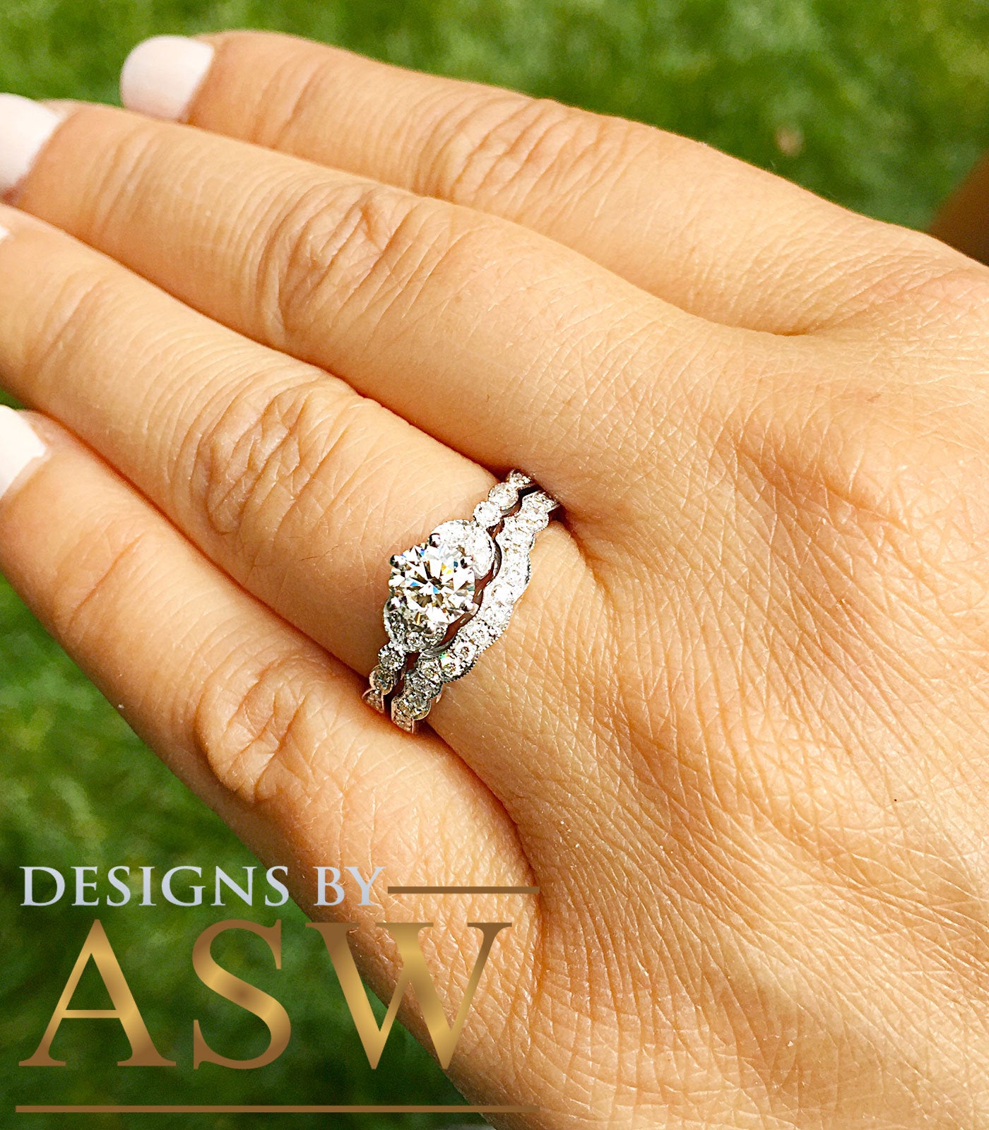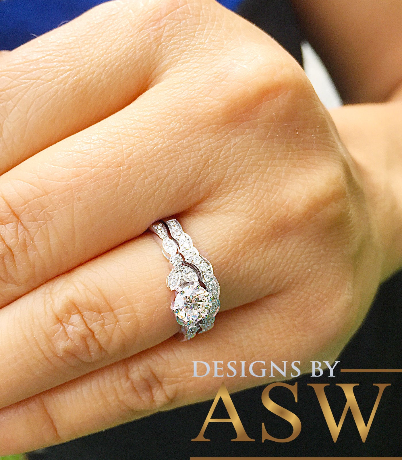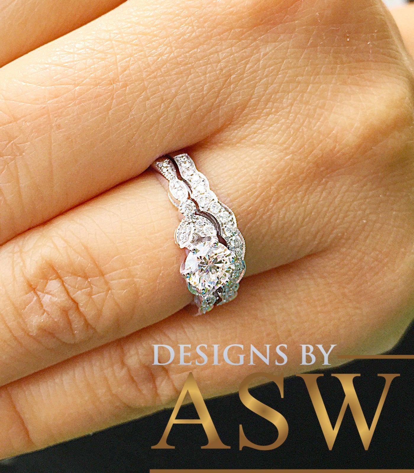 THIS BEAUTIFUL 1.00CT ROUND CUT FOREVER ONE MOISSANITE IS SET ON A STUNNING SETTING WITH LARGE DIAMONDS DESIGN