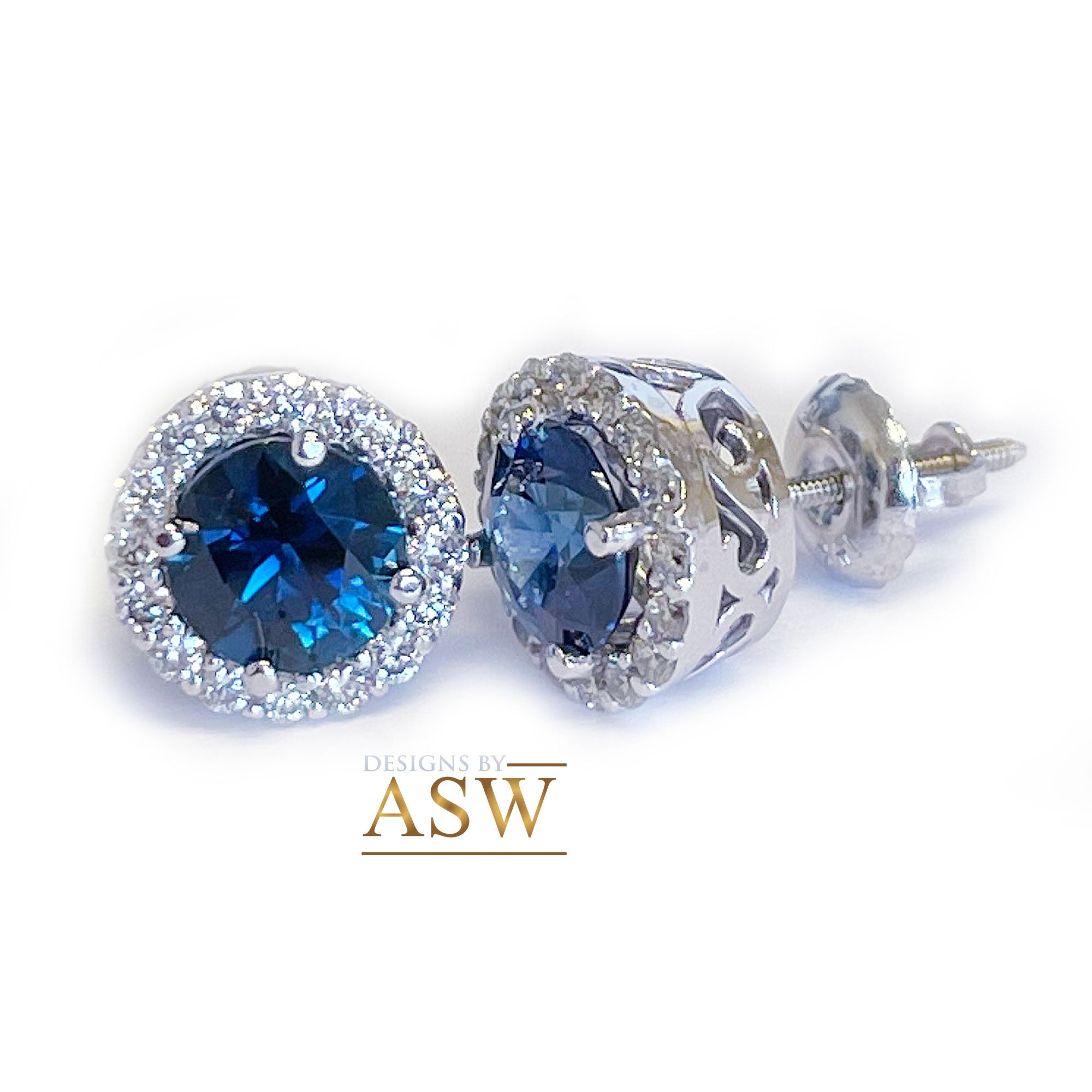 14K Solid White Gold Round Cut Natural Sapphire Diamond Deco Style Engagement, Wedding, Anniversary, Bridal, Halo, Stud Earrings 2.00ctw