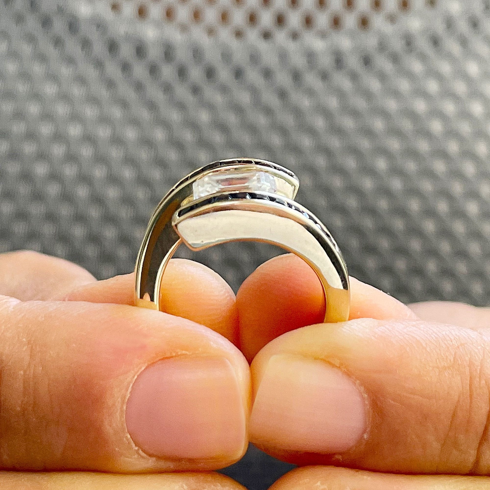 Huge 14k yellow gold, 3.50ctw emerald moissanite and princess cut natural sapphires, art-deco semi tension set style engagement ring