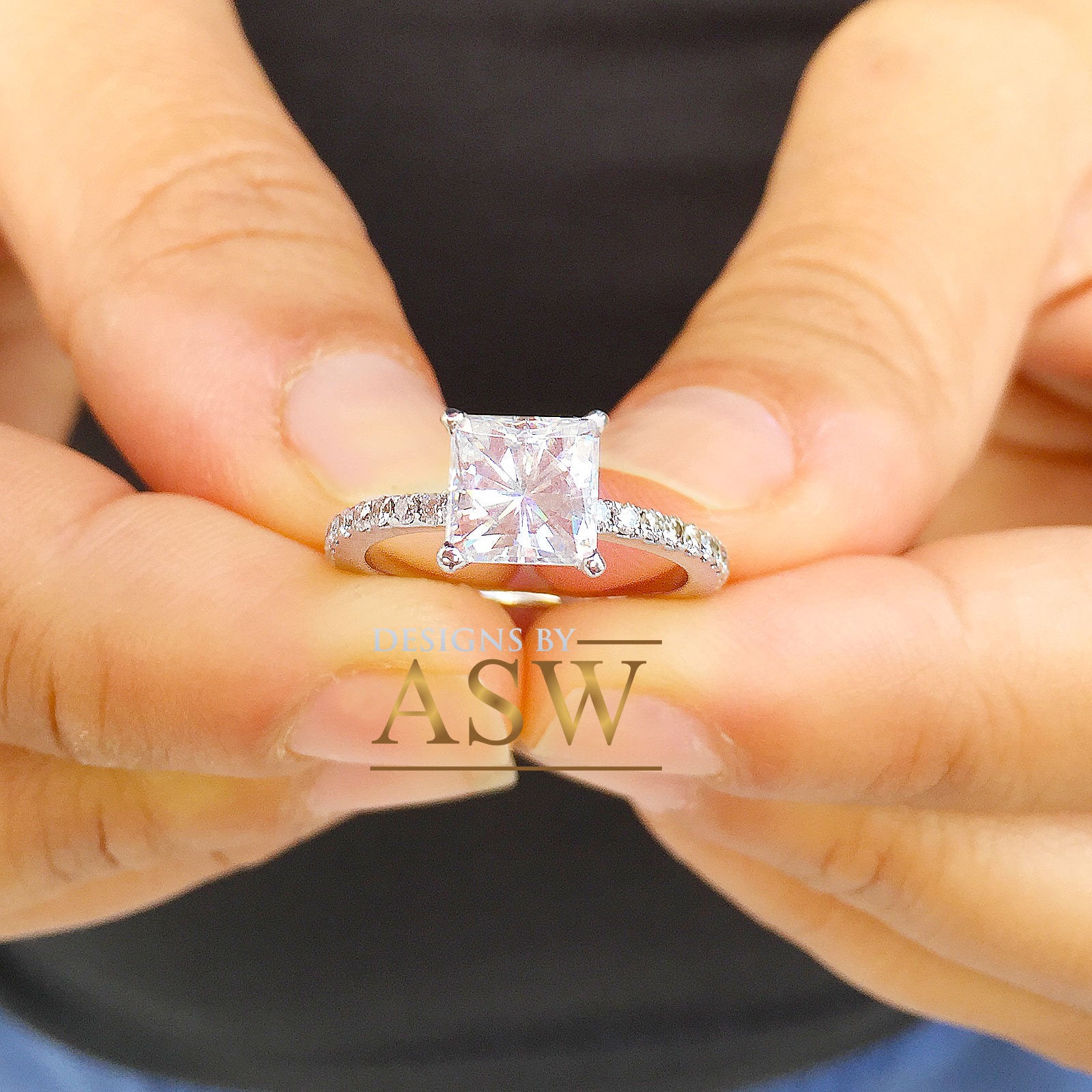 14K WHITE GOLD, 2.00CTW PRINCESS FOREVER ONE MOISSANITE & ROUND CUT DIAMONDS, ART-DECO / ANTIQUE PRONG SET STYLE ENGAGEMENT RING