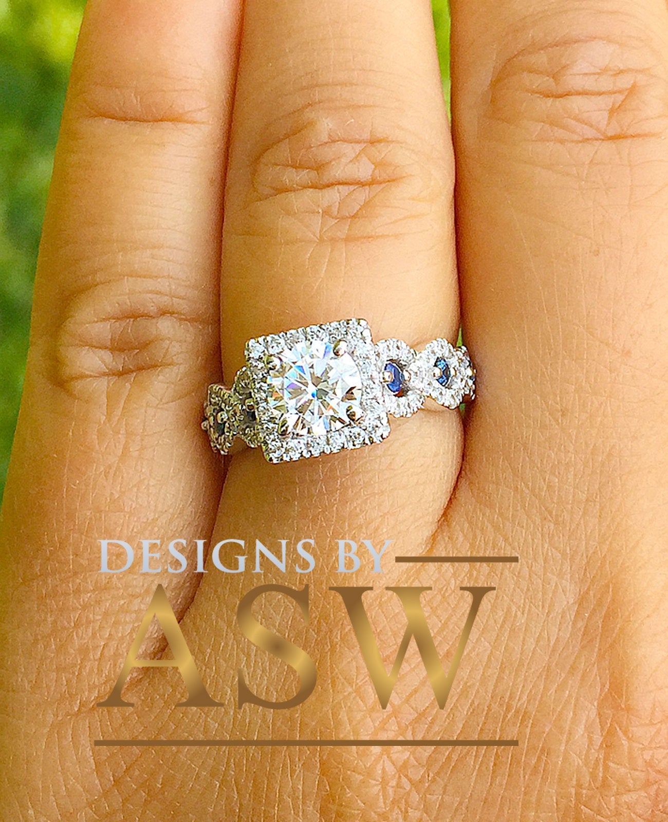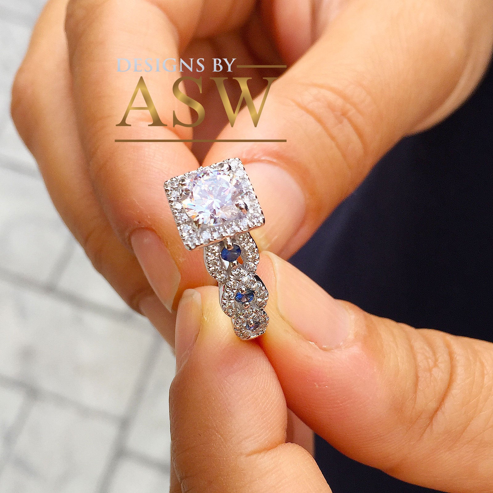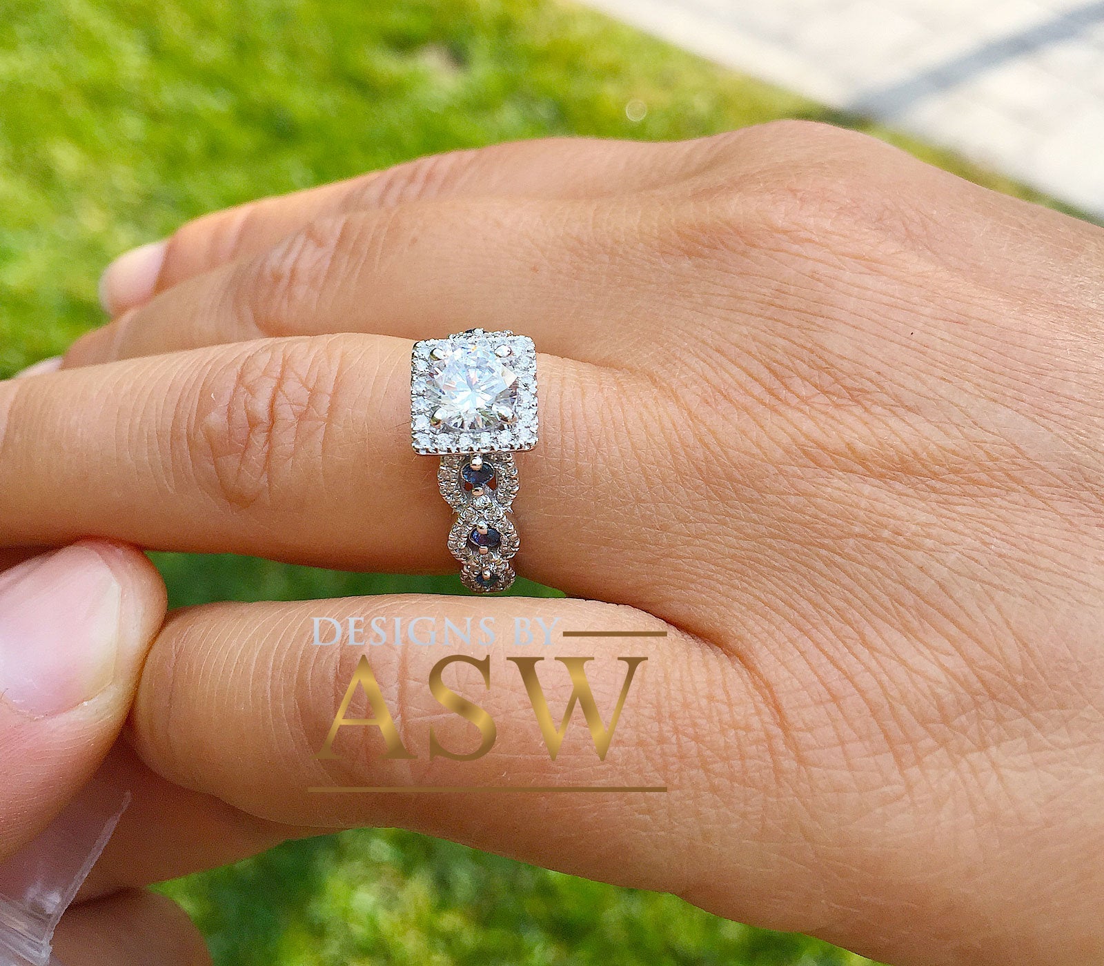 14k White Gold Round Cut Forever One Moissanite and Diamond And Sapphire Engagement Ring, Bridal, Wedding, Natural Diamonds Halo 2.00ctw