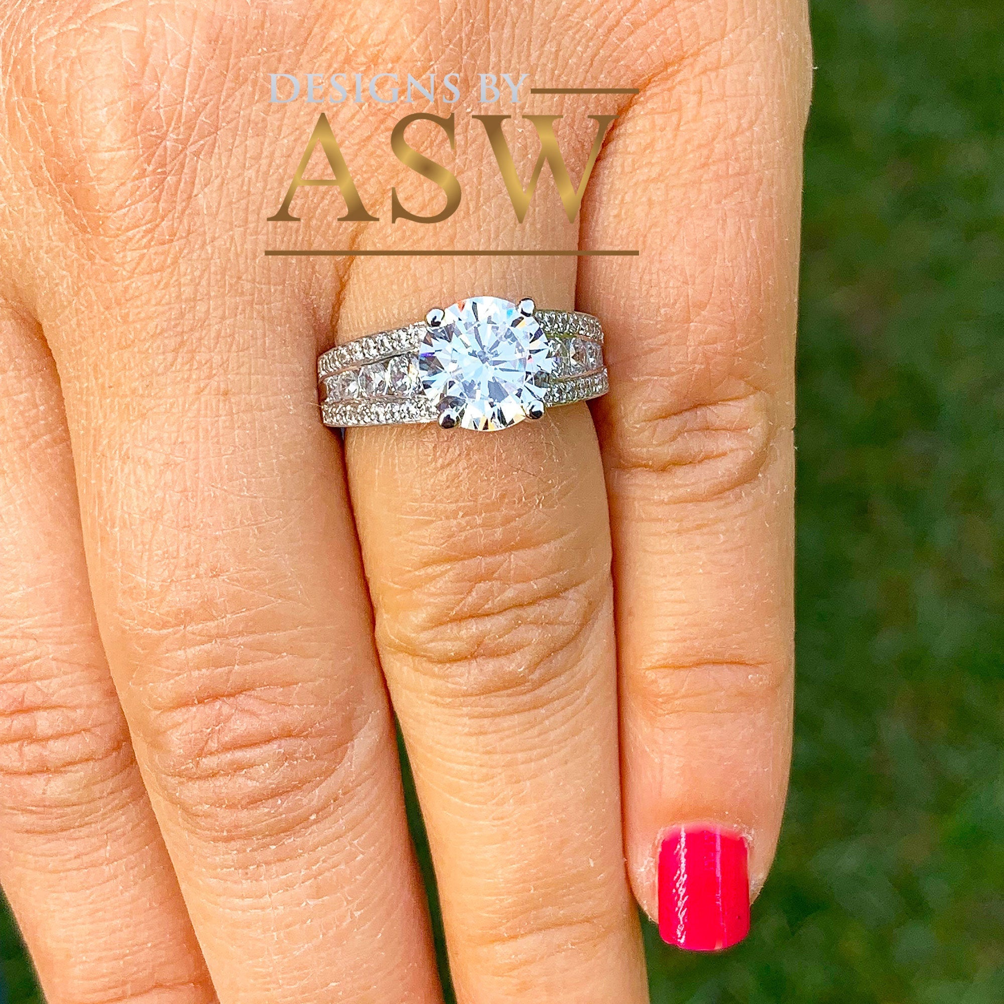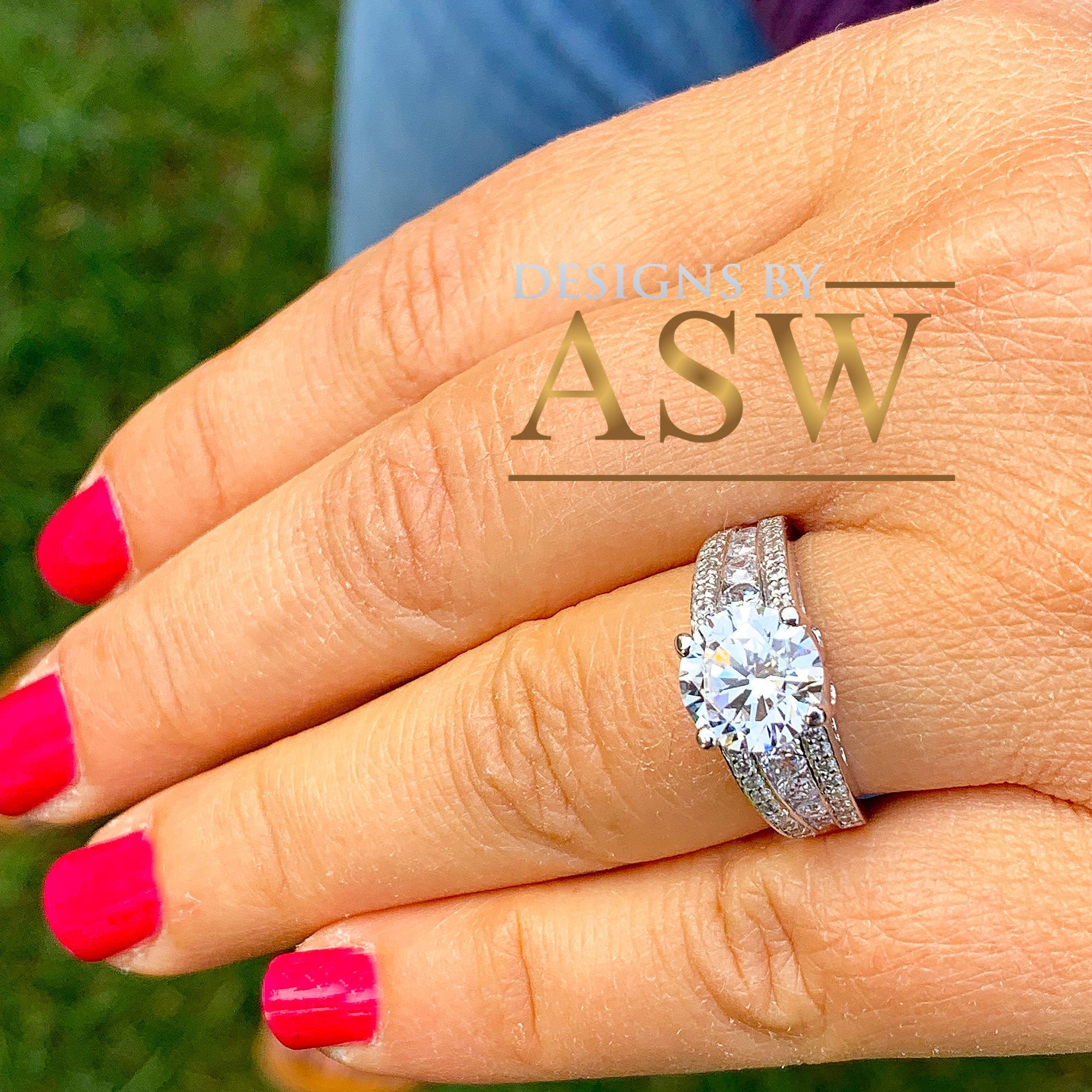 14K WHITE GOLD, 3.50CTW ROUND SHAPE FOREVER ONE MOISSANITE & ROUNDS CUT DIAMONDS, ART-DECO PRONG SET STYLE ENGAGEMENT RING THIS BEAUTIFUL 2.00CT ROUND CUT FOREVER ONE MOISSANITE IS SET ON A STUNNING SETTING WITH LOTS OF DIAMONDS Total weight is 3.50ct.