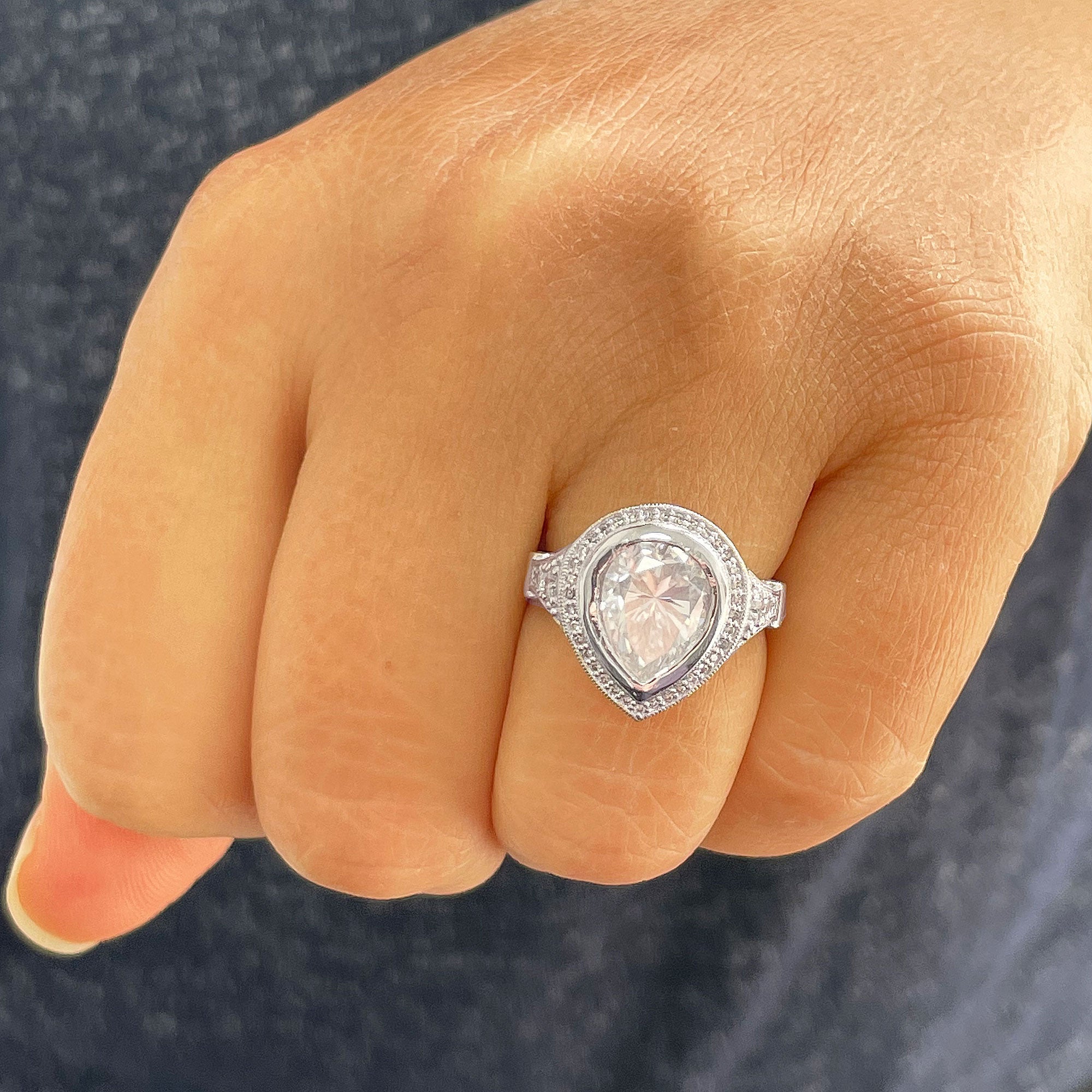 14k Solid White Gold Pear Cut Moissanite and Natural Round Cut Diamond Engagement Ring Halo, Bezel Set 4.25ctw