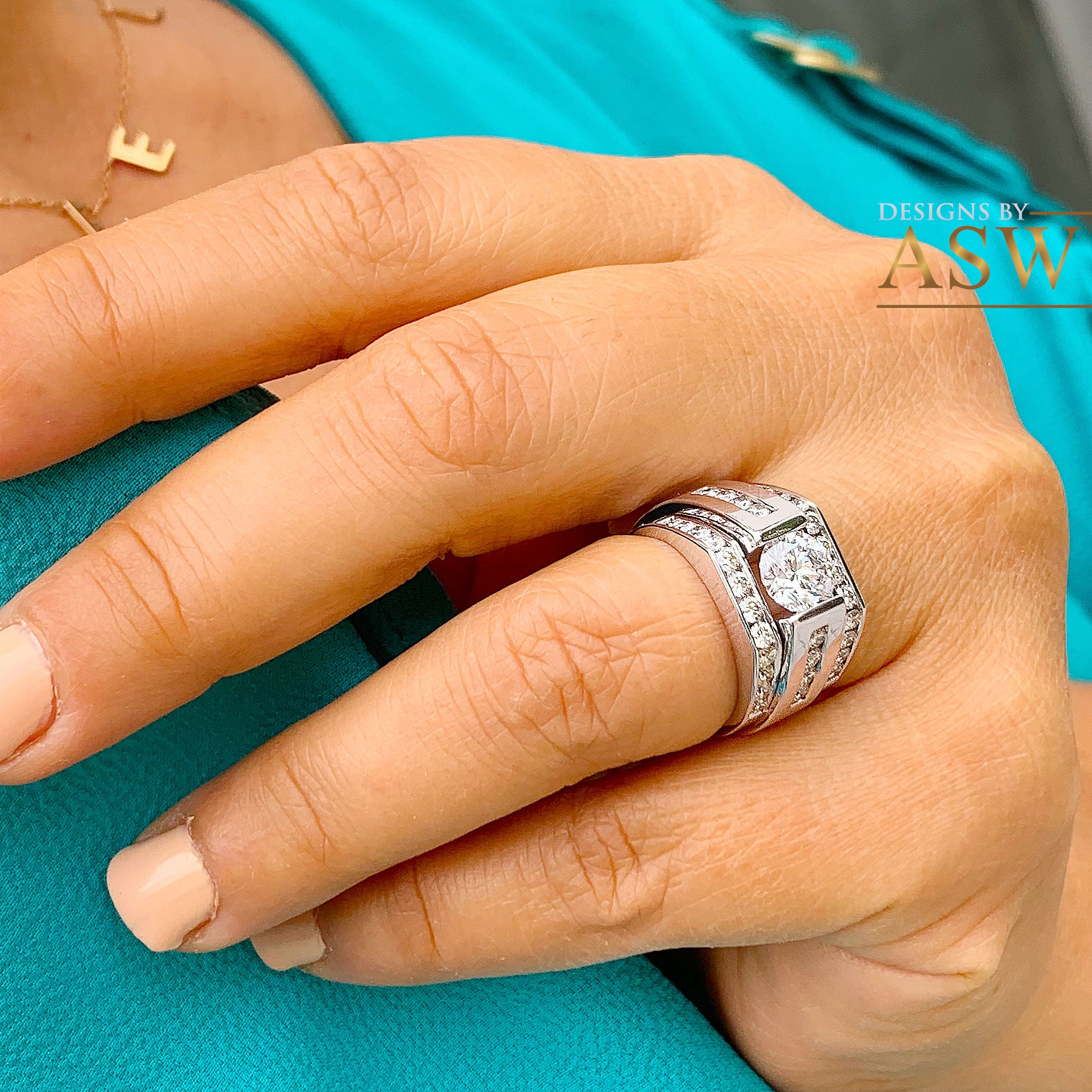 Women's 14k Solid And Heavy White Gold Round Moissanite And Natural Diamonds Engagement Ring Two Bands Tension Set Bridal Set 2.50ct