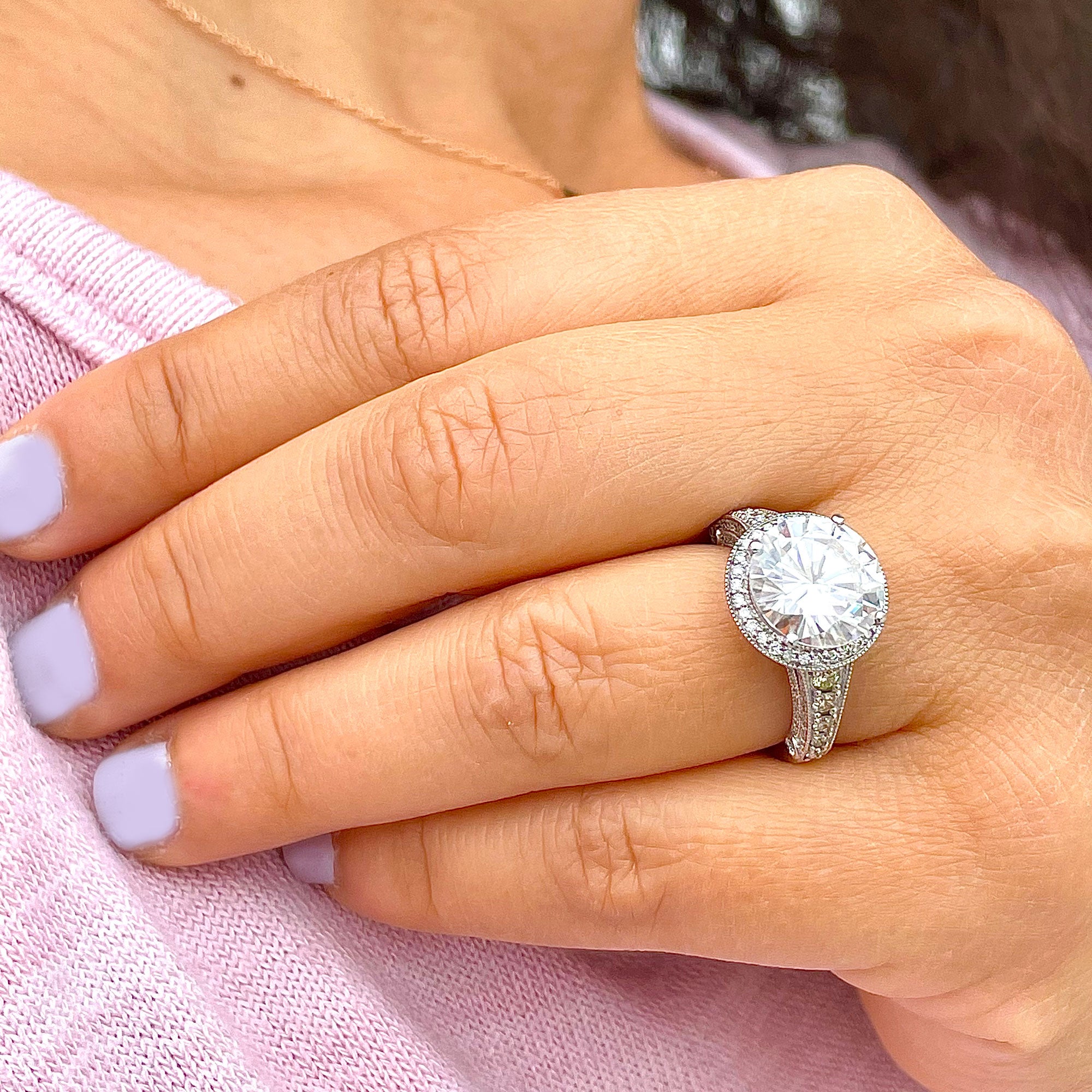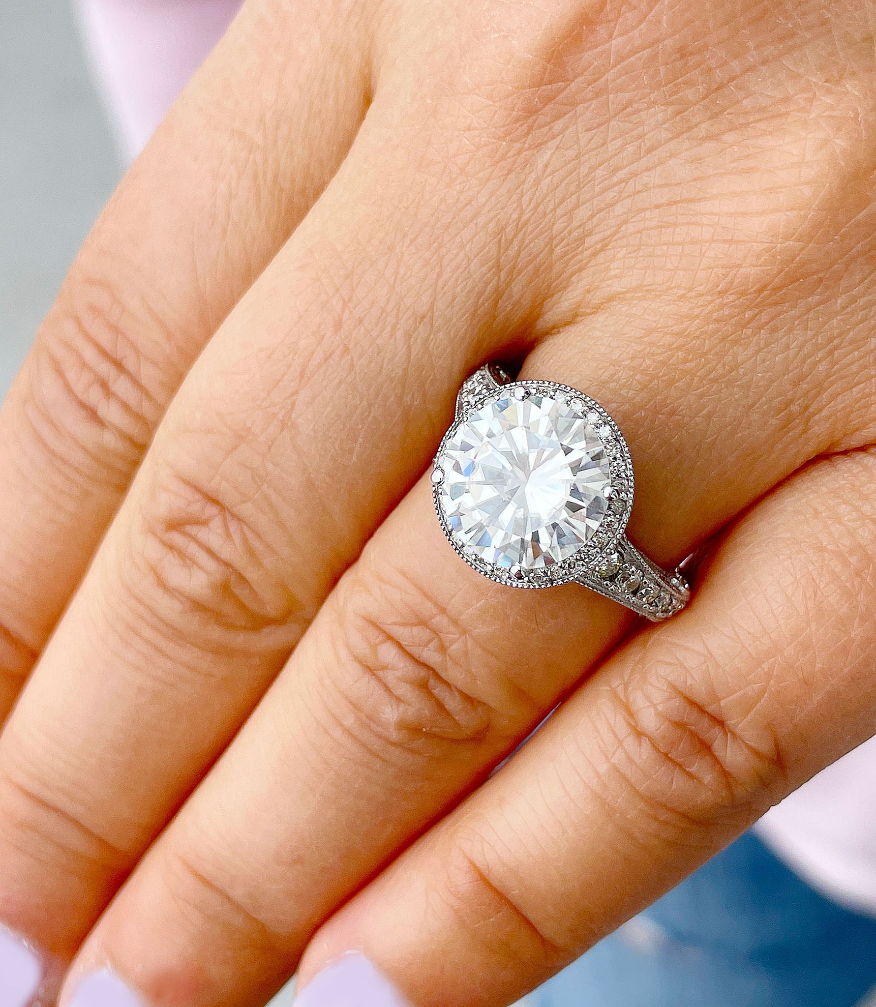 Color: G, pure colorless shades up to six grades whiter than conventional moissanite. With 10 percent more brilliance than diamond explodes with light and shine.