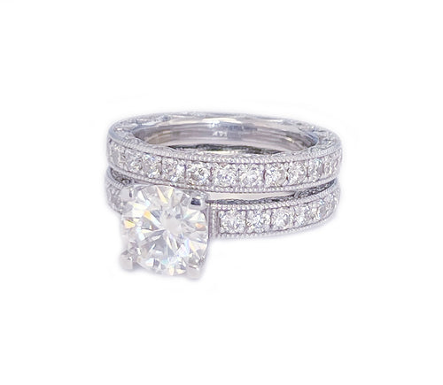 Filigree 14K Solid White Gold Round Cut Moissanite And Natural Diamond Engagement Ring Three Stone Bezel Set Antique Style 2.00ctw