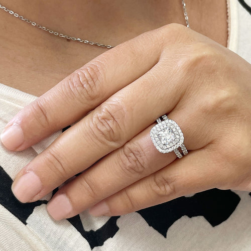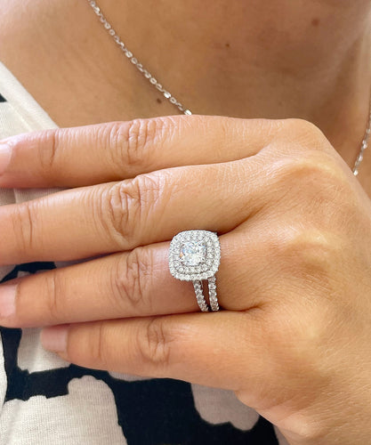 14K White Gold Cushion Cut And Round Cut Natural Diamond Engagement Ring And Band Bridal Wedding Set Double Halo Natural Diamonds 1.85ctw