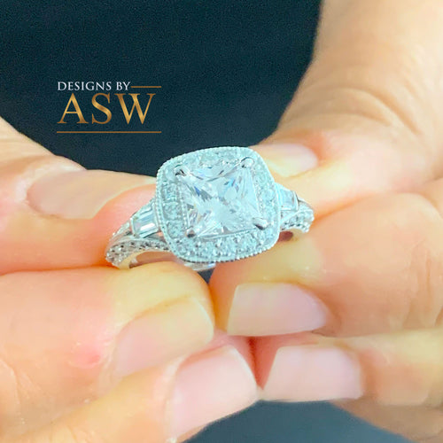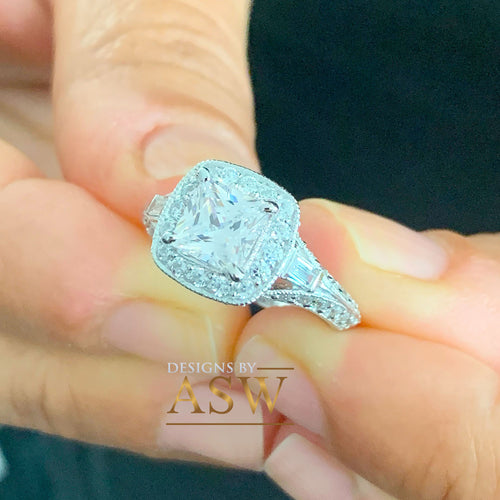 14K Solid White Gold Princess Cut Moissanite and Natural Diamond Engagement Ring Deco Halo, bridal, wedding, prong set 1.95ctw