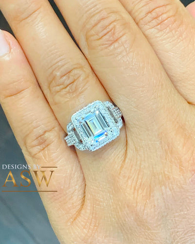 14K Solid White Gold Emerald Cut Forever One Moissanite And Round Cut Natural Diamond Engagement Ring Halo Prong Set Bridal Wedding 3.70ctw