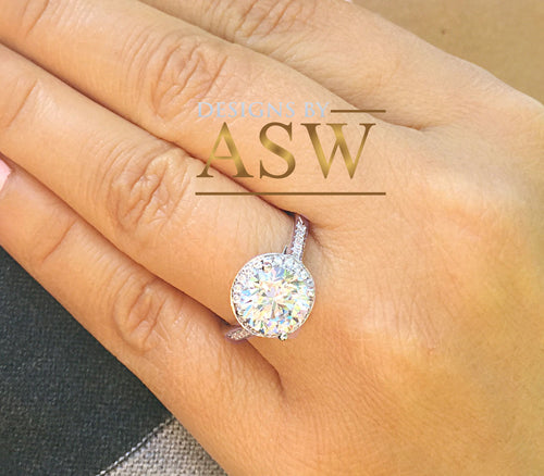Large Women's 14K Solid White Gold Round Cut Forever One Moissanite and Natural Diamond Engagement Ring Halo Prong 3.50ct