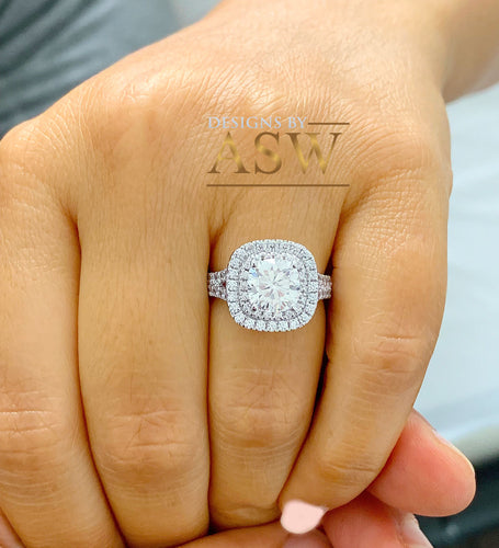 Large Women's 14K Solid White Gold Cushion Cut Moissanite and Rond Cut Natural Diamond Engagement Ring Double Halo Prong 2.80ct