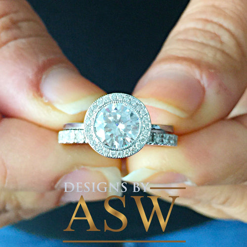 14k White Gold Round Cut Forever One Moissanite and Natural Diamond Engagement Ring And Band Bezel Set Halo Bridal Wedding Anniversary 2.00