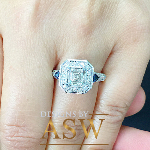 14k Solid White Gold Asscher Cut Forever One Moissanite and Round Natural Diamonds Engagement Deco Halo, Bridal, Wedding, Sapphire 2.05ctw