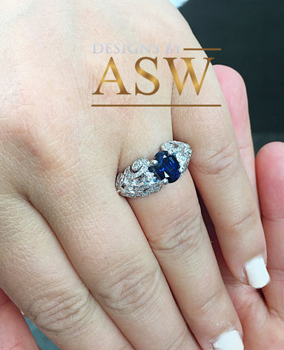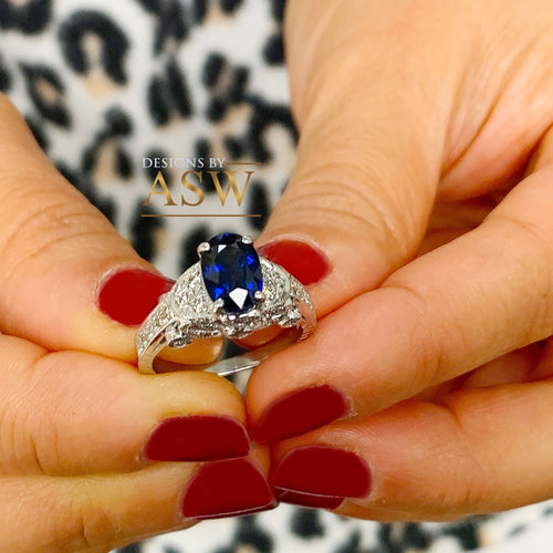 14k Solid White Gold Oval Cut Natural Blue Sapphire And Natural Diamonds Engagement Ring Deco, Bridal, Wedding, Anniversary, Propose 2.10ctw