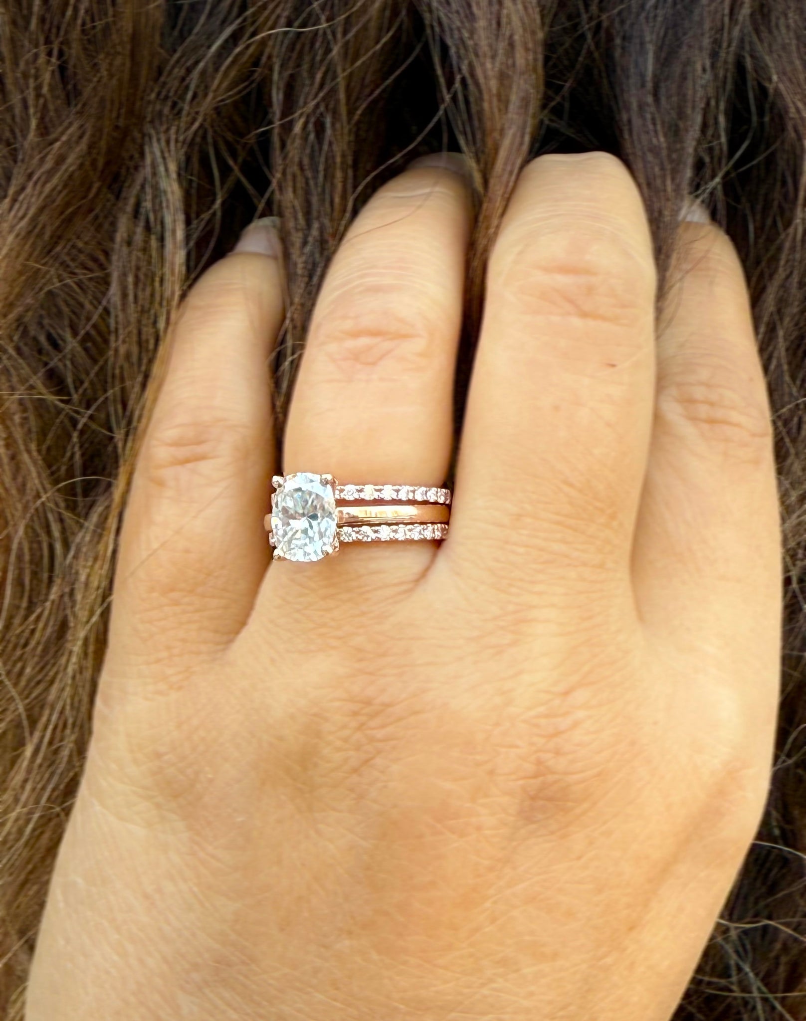 Perfect for brides who love a clean and elegant style, this moissanite engagement ring with matching bands is both timeless and versatile. Its blend of classic cushion cut brilliance, minimalist half-eternity bands, and luxurious rose gold makes it a meaningful and unforgettable choice for any occasion.