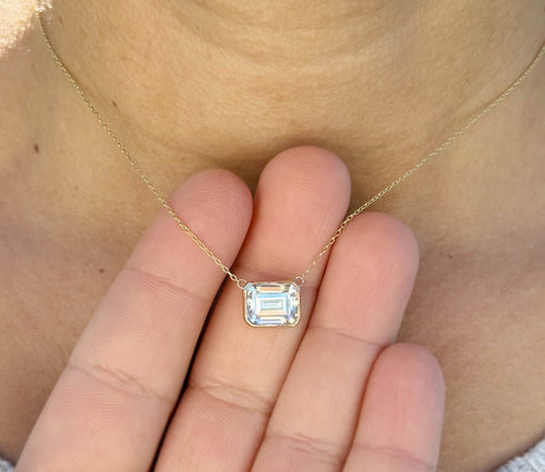 Emerald Cut Moissanite Bezel Set Solitaire Necklace And Chain In Dainty Minimalist 14k Solid Yellow Gold Pendant Bridal Wedding Gift 3.50ct