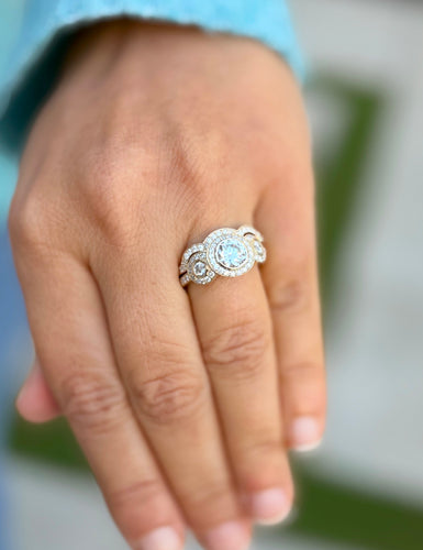 Round Cut Simulated Diamonds Engagement Ring And Matching Band Three Stone Wedding Set Halo Bezel Bridal Set 14K Solid Yellow Gold 2.75ctw