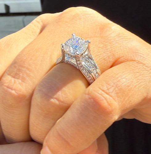 Cushion Cut and Round Cut Moissanites Engagement Ring Hidden Halo Design Wedding Ring Set In 14K Solid Heavy White Gold Bridal Ring 5.50ctw