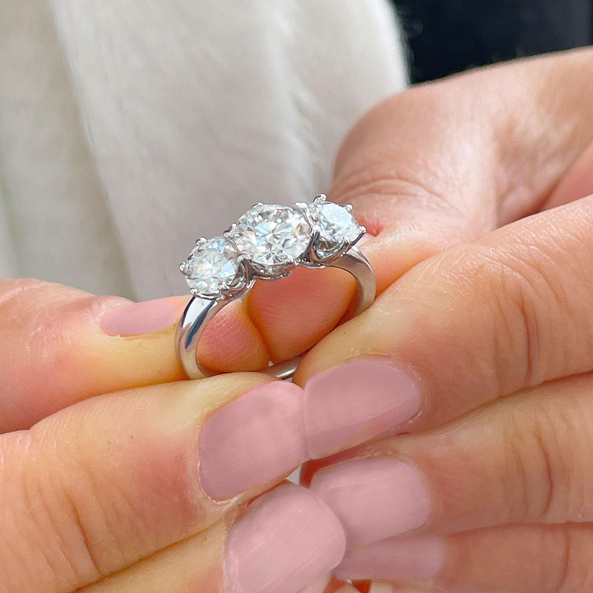 14k Solid White Gold Round Cut Forever One Moissanite Engagement Ring, Bridal, Wedding Deco Three Stone Style Prong Set 2.00ctw