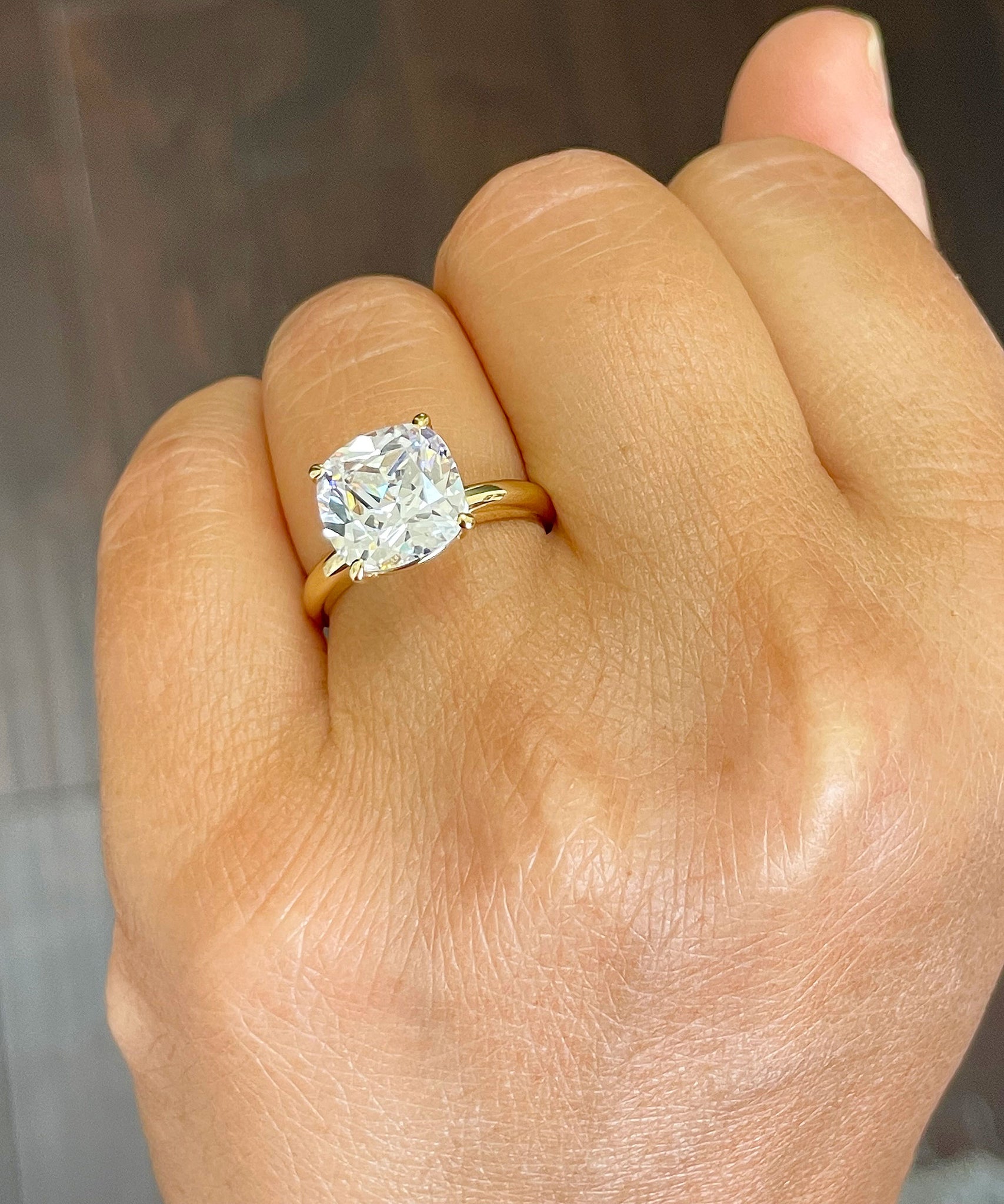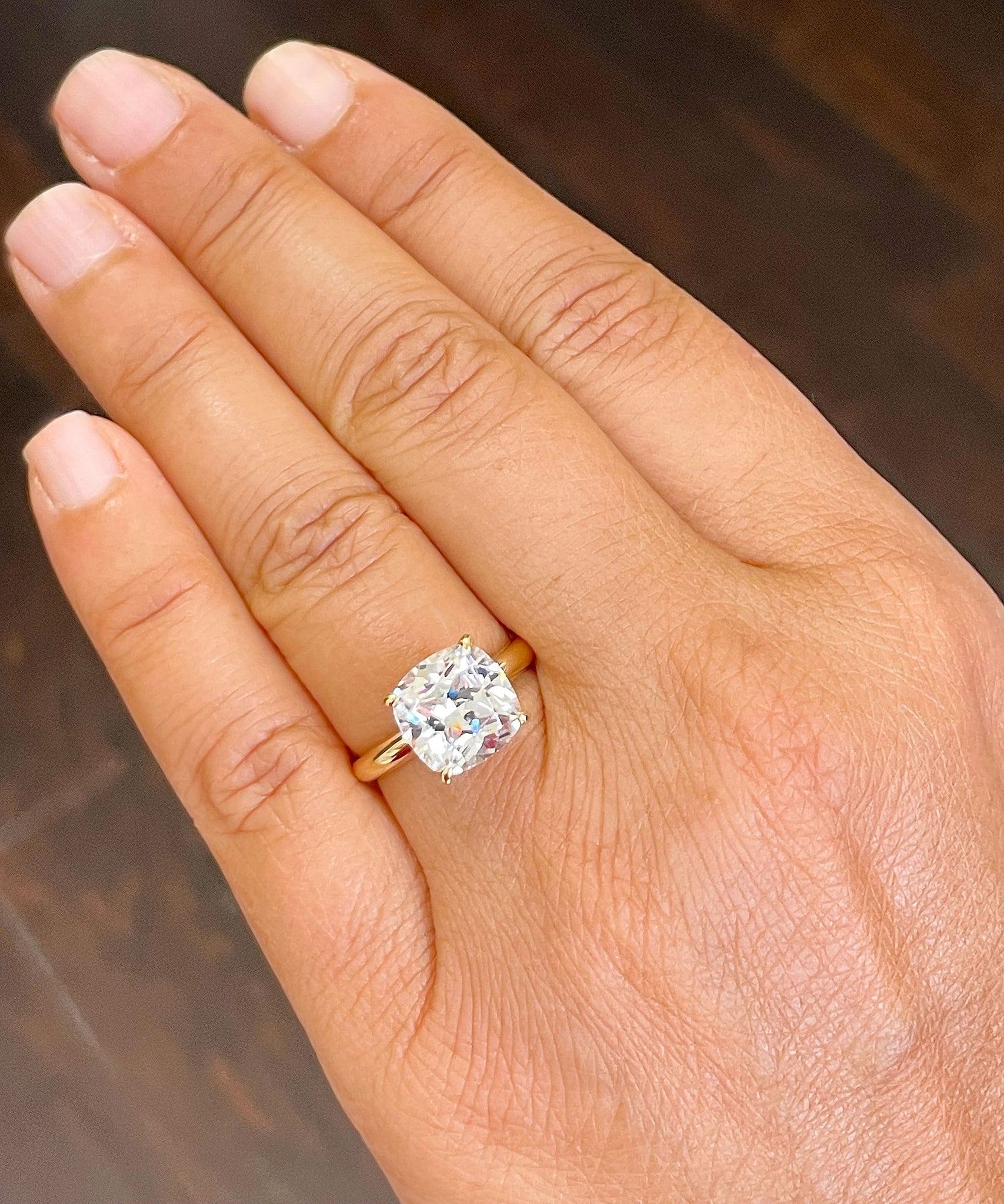 14K SOLID YELLOW GOLD, 4.00CTW CUSHION CUT FOREVER ONE MOISSANITE, ART-DECO PRONG SET SOLITAIRE STYLE ENGAGEMENT RING