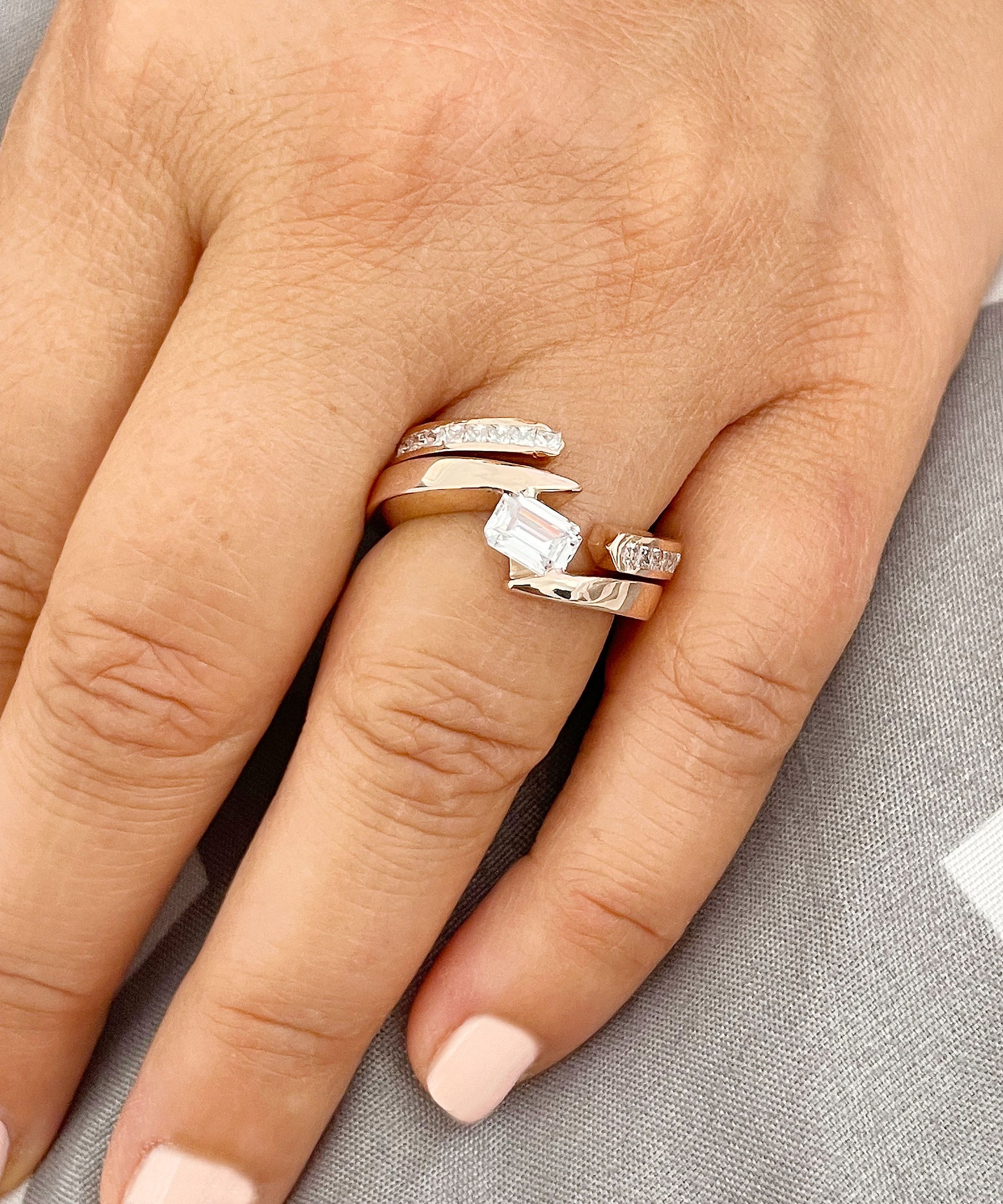 Beautiful 14k Solid And Heavy Rose Gold Emerald Cut Forever One Moissanite Engagement Ring Deco Bridal Semi Tension Set 2.00ctw
