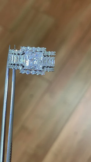 HUGE HEAVY 14K SOLID WHITE GOLD, 4.80CTW PRINCESS, EMERALD CUT BAGUETTES AND ROUND MOISSANITE , ART-DECO PRONG SET HALO STYLE ENGAGEMENT RING AND TWO BANDS
