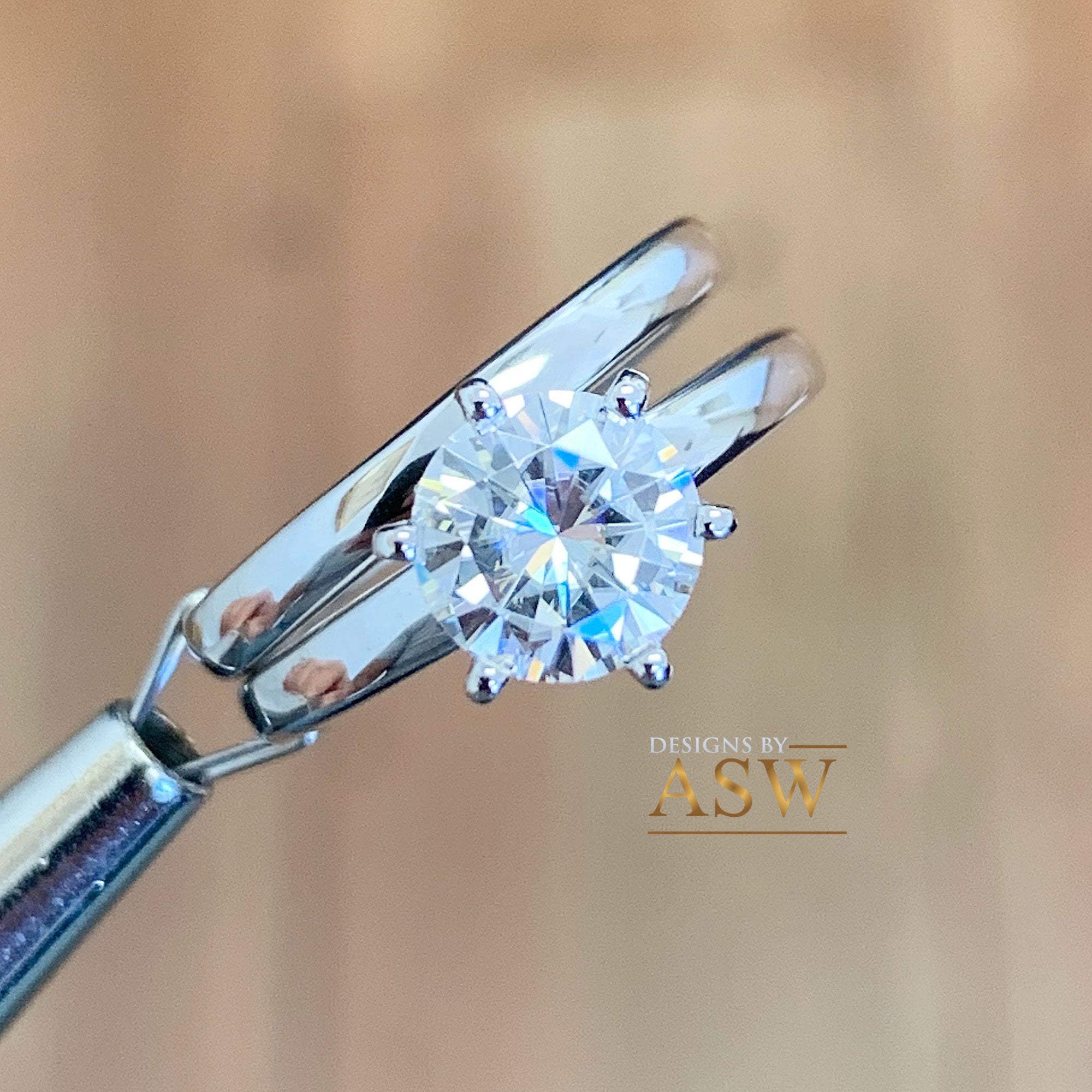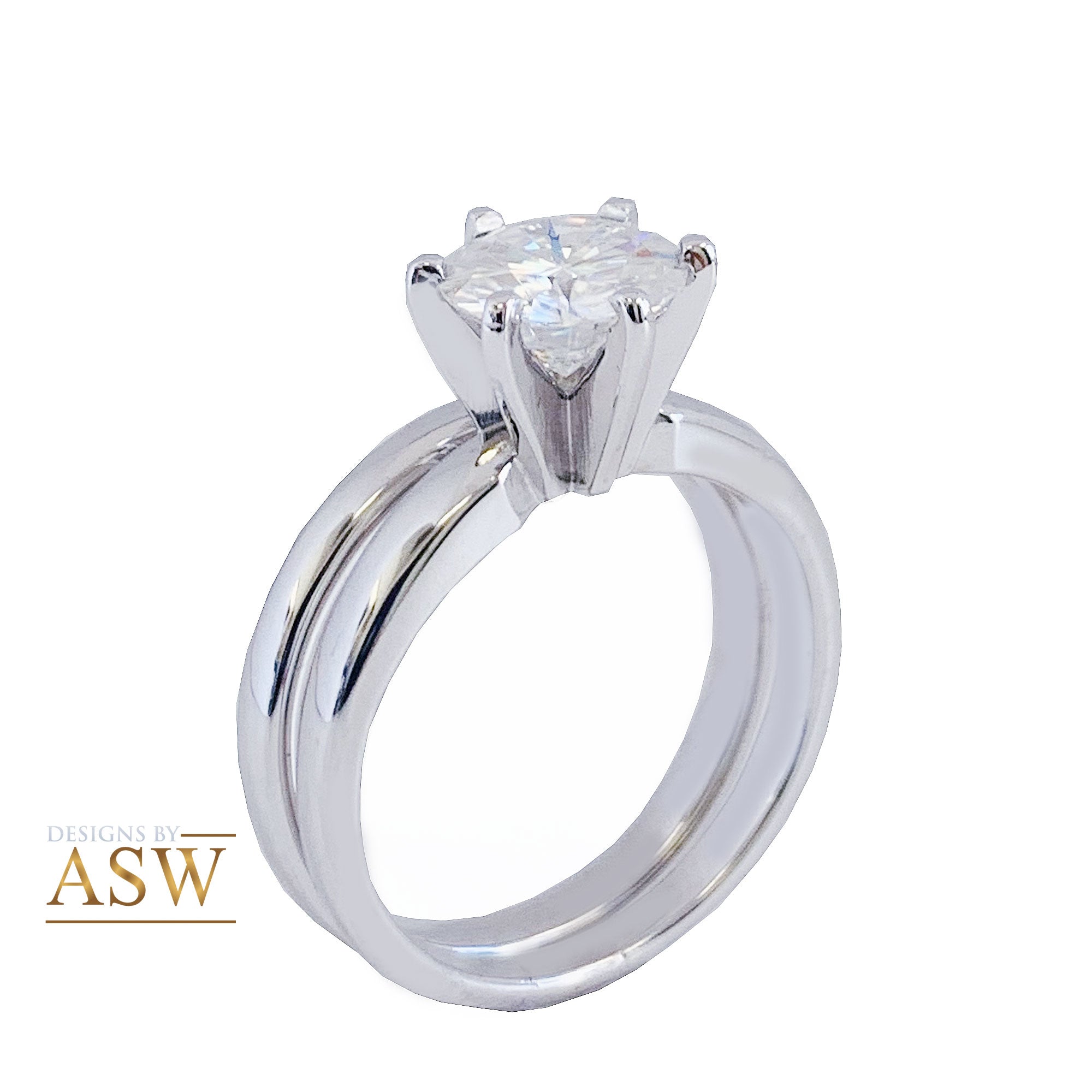 14K SOLID WHITE GOLD, 1.20CTW ROUND CUT MOISSANITE, ART-DECO SIX PRONG SET SOLITAIRE CATHEDRAL STYLE ENGAGEMENT RING AND BAND