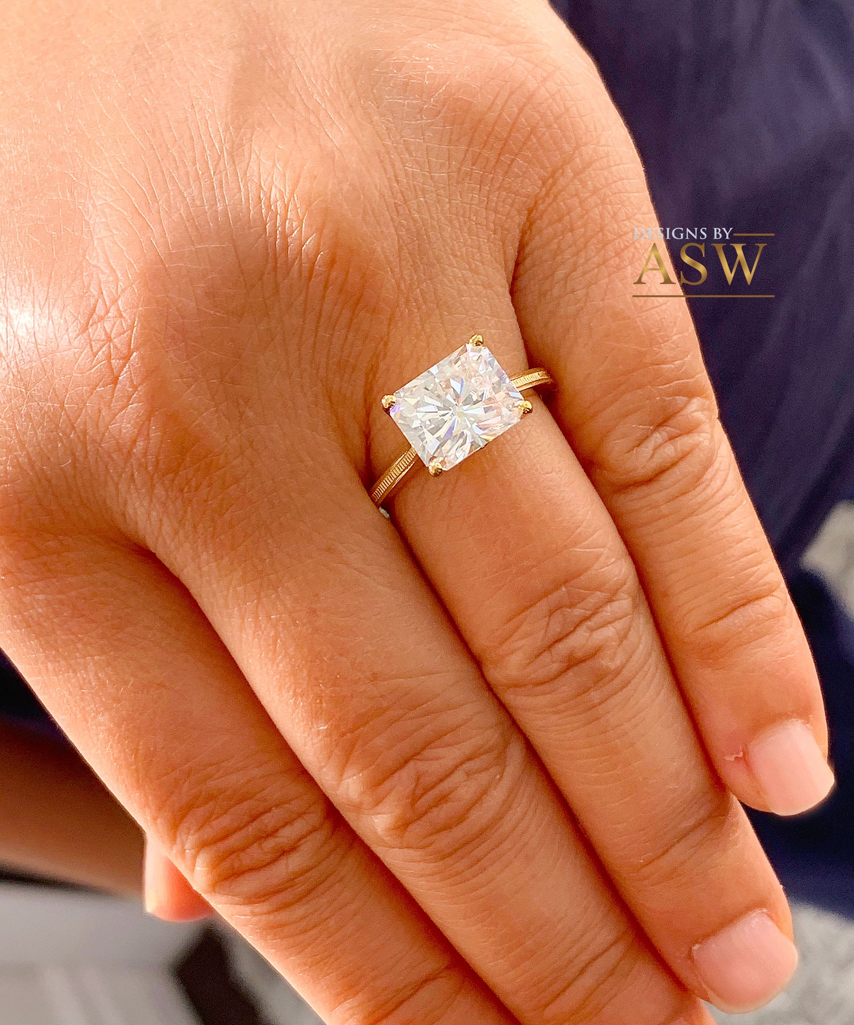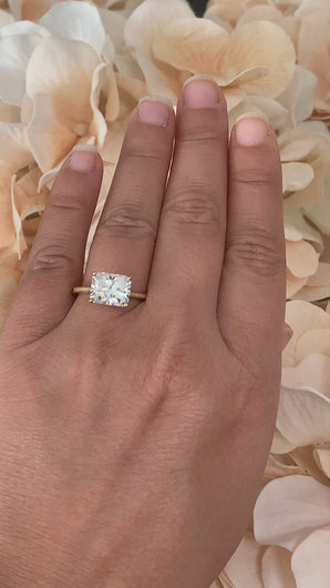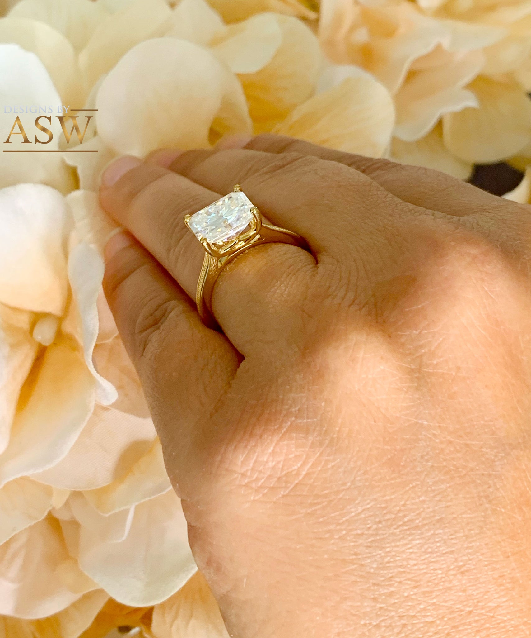14K SOLID YELLOW GOLD, 3.50CTW RADIANT CUT FOREVER ONE MOISSANITE, ART-DECO PRONG SET SOLITAIRE STYLE ENGAGEMENT RING