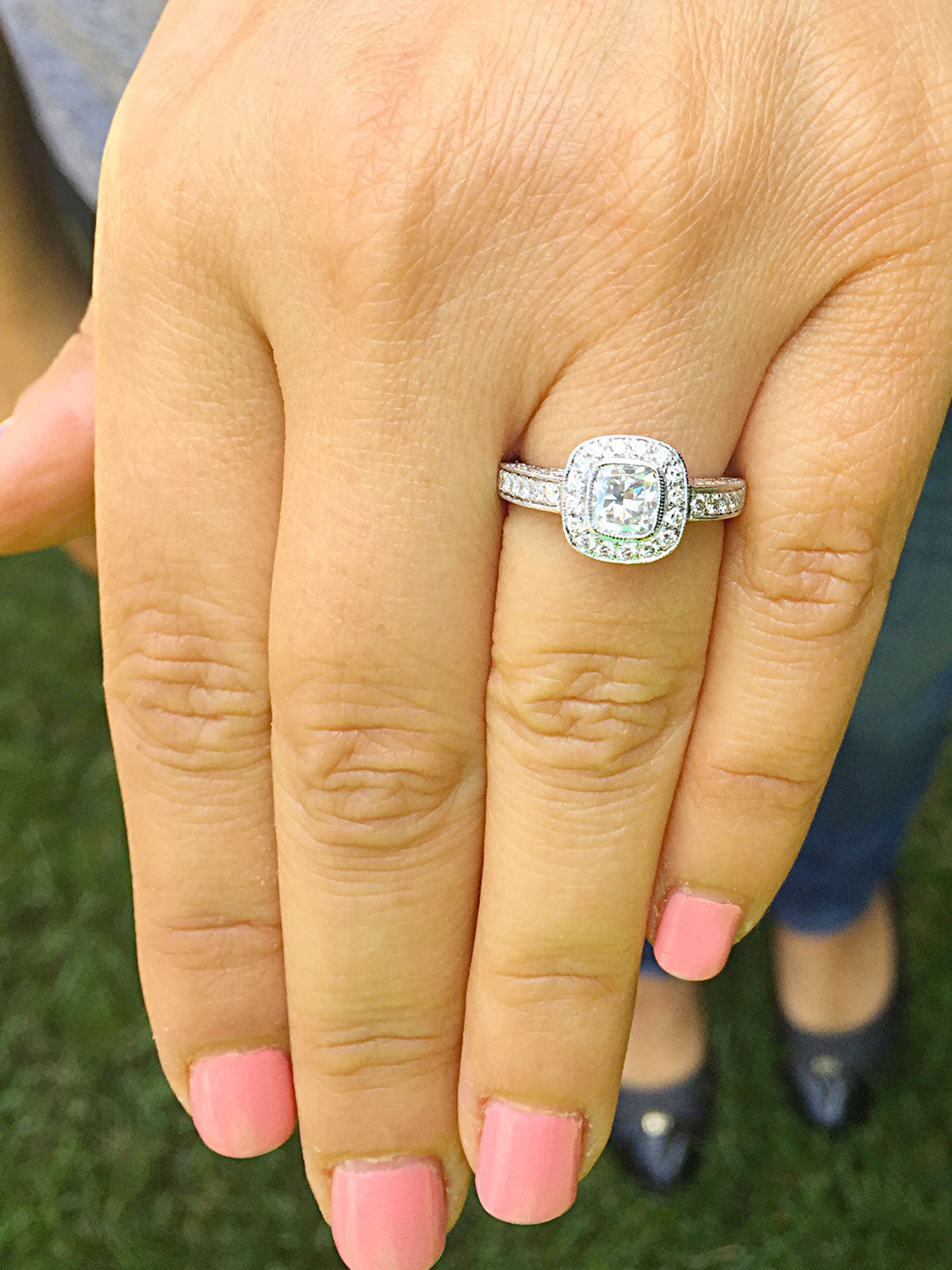 THIS BEAUTIFUL 1.00CT CUSHION CUT MOISSANITE IS SET ON A STUNNING SETTING WITH LOTS OF DIAMONDS AND DESIGN, VERY SIMILAR TO THE LEGACY DESIGN SEEN AT TIFFANY THE DETAIL IN THIS HAND-ENGRAVED SETTING SPANS VIRTUALLY THE ENTIRE BAND WITH FINE MILLE GRAIN ACCENTS DIAMONDS THROUGHOUT THE SETTING