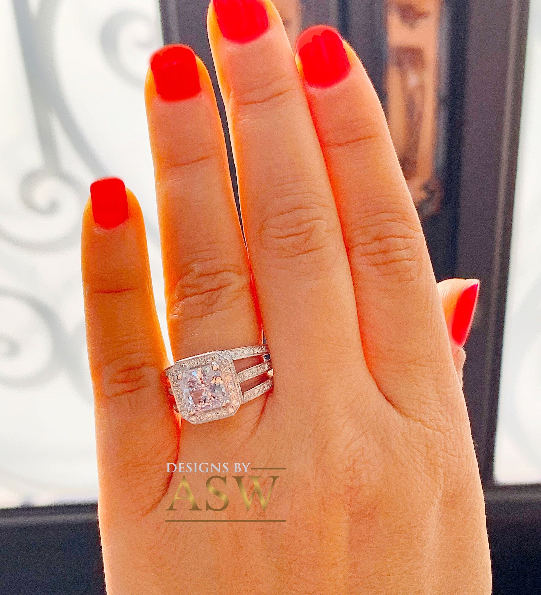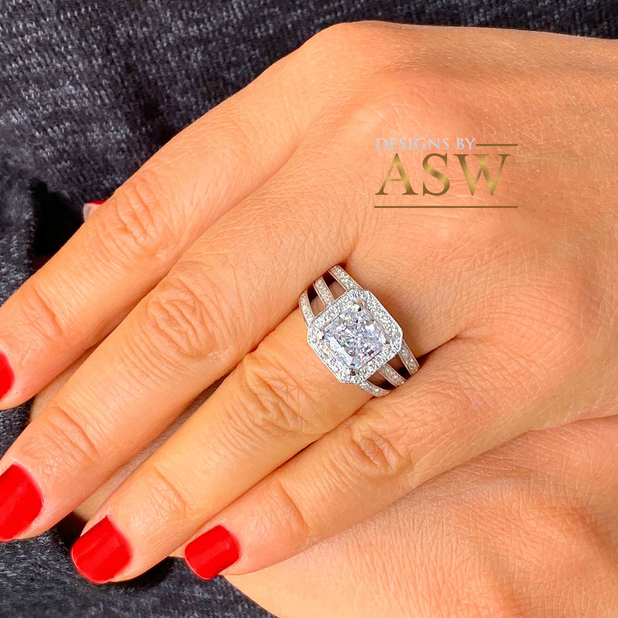THIS STUNNING 3.00CT PRINCESS CUT FOREVER ONE MOISSANITE IS SET ON A VERY CLASSY AND ELEGANT SETTING WITH BEAUTIFUL ROUND CUT DIAMONDS ON THE SIDES IN A HALO TRIPLE SHANK DESIGN THE DETAIL IN THIS ENGRAVED SETTING IS STUNNING