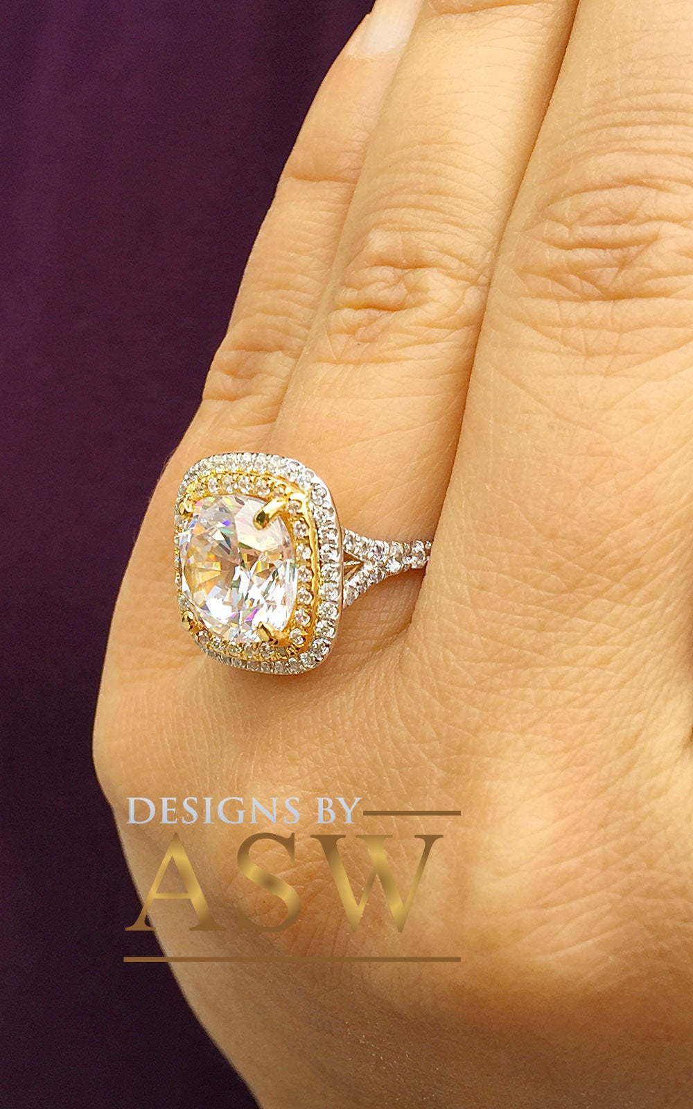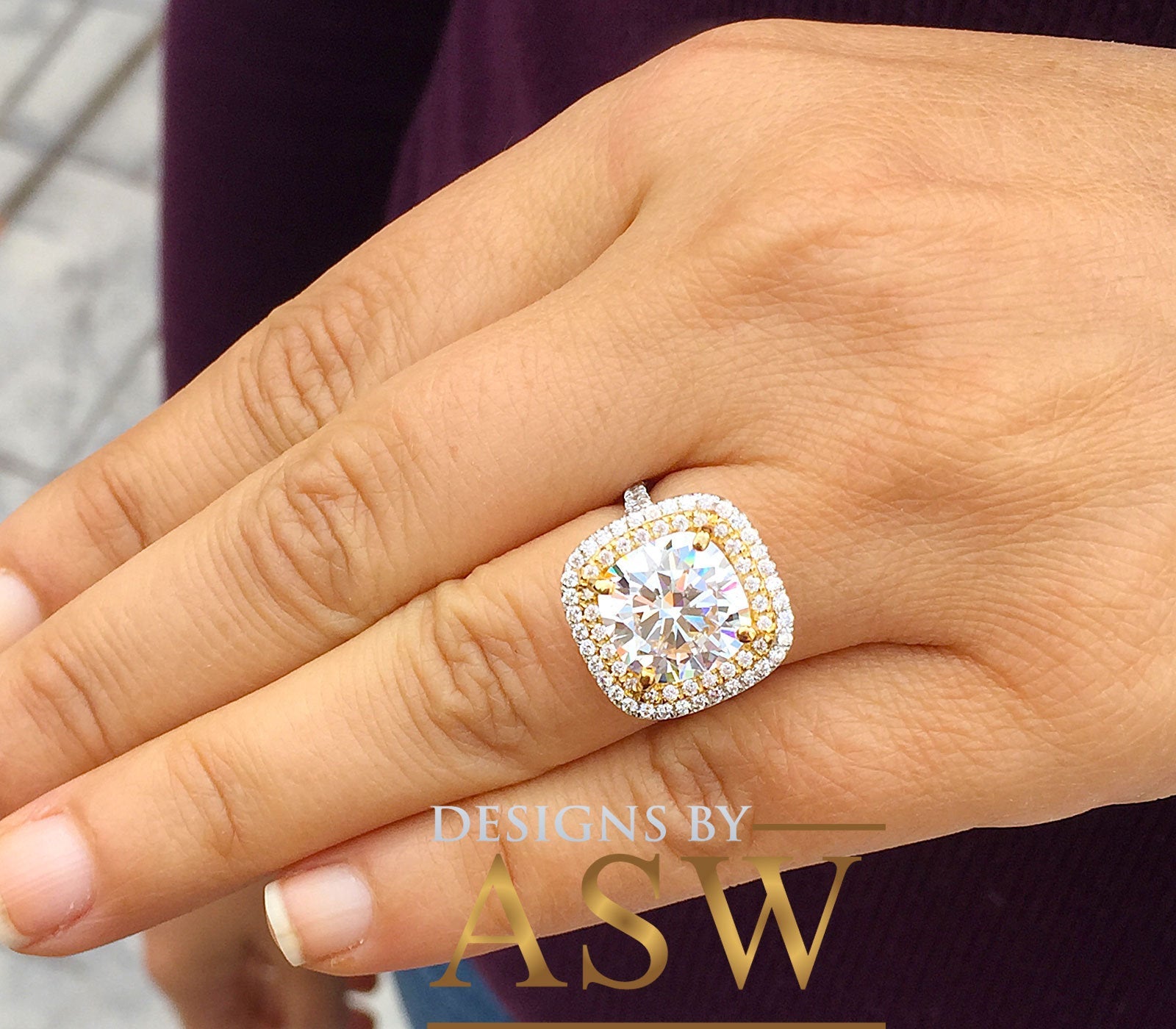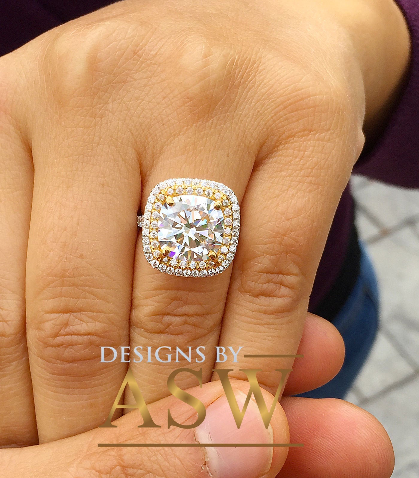 Huge 14K Solid White and Yellow Gold Cushion Cut Forever One Moissanite and Round Cut Natural Diamond Engagement Ring Double Halo 6.50ct