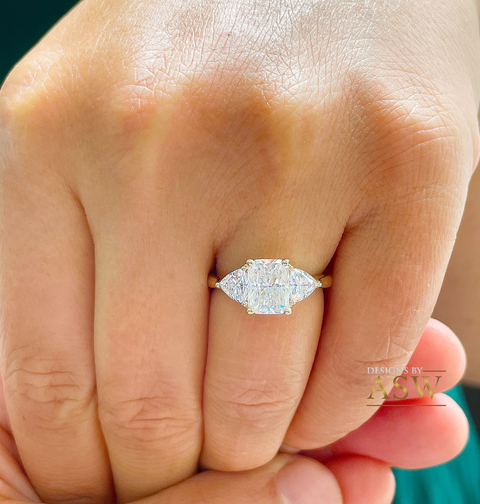Large 14k Solid Yellow Gold Radiant and Triangle Cut Moissanite Engagement Ring, Bridal, Wedding Deco Three Stone Style 3.30ctw