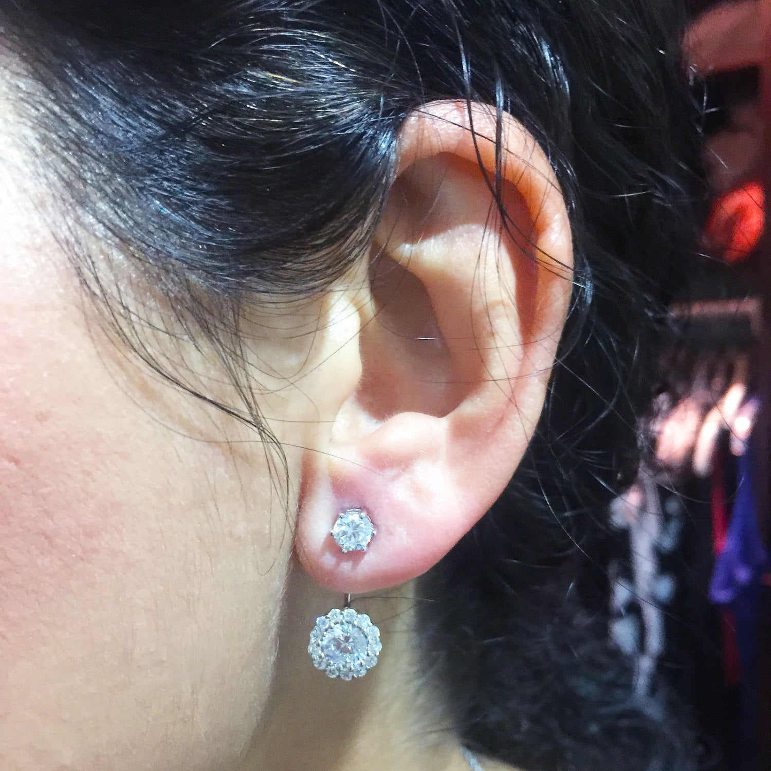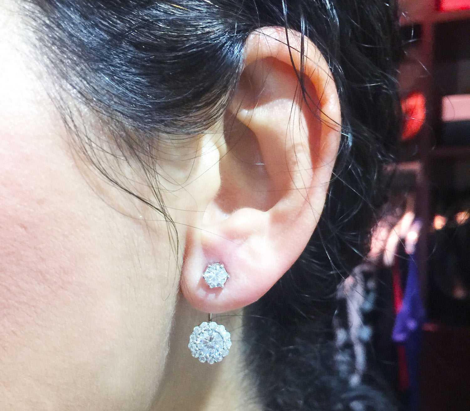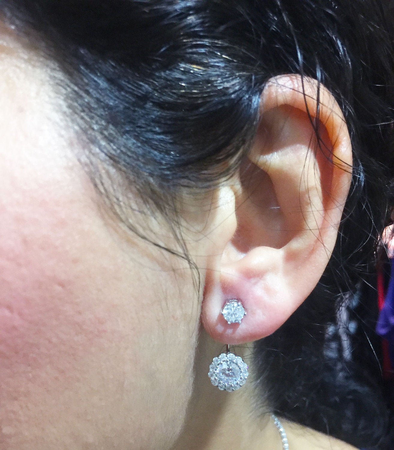 Each side has 1.00ct on bottom and 0.30ct each side on top and 0.40ctw smaller round cut moissanites.