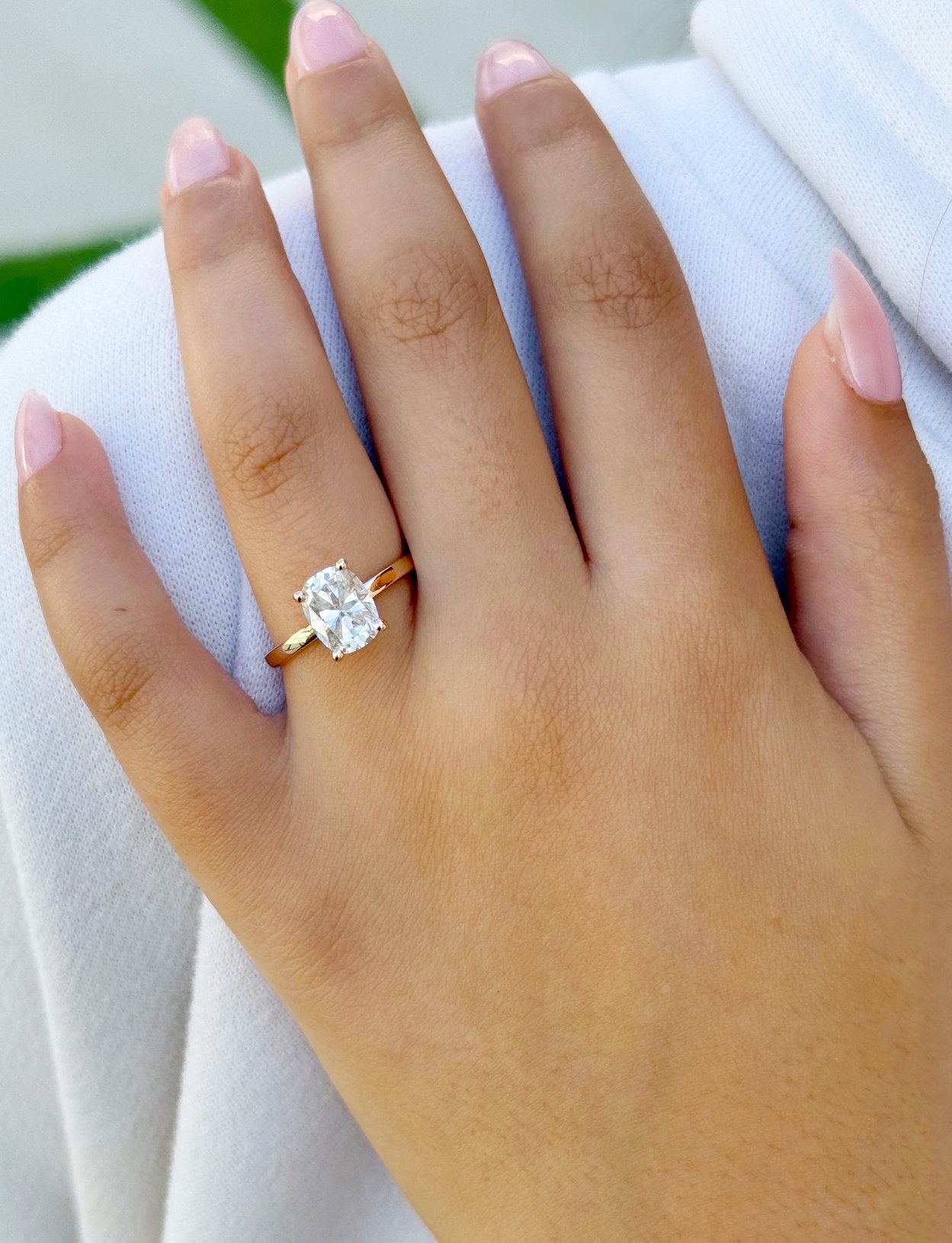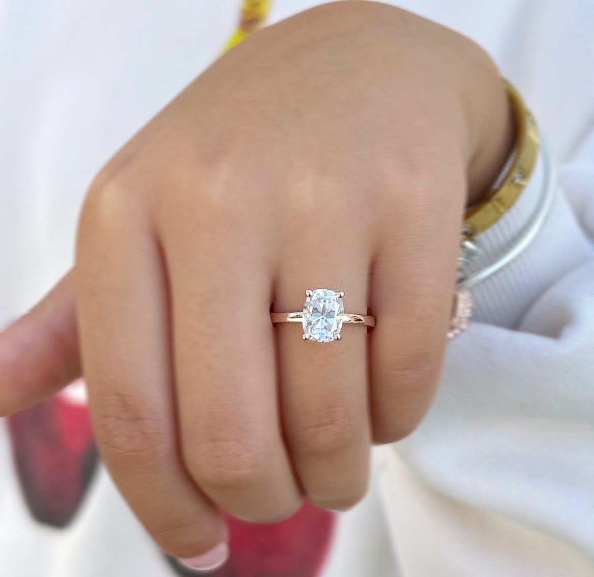 This Solitaire Rectangular Cushion Cut Moissanite Engagement Ring is a stunning embodiment of modern elegance and sophistication. Featuring a striking 2.00ct rectangular cushion-cut moissanite, this ring captures the eye with its unique shape and exceptional brilliance. The four-prong setting ensures the moissanite is securely held while allowing for maximum light exposure, creating a dazzling sparkle that is sure to impress.
