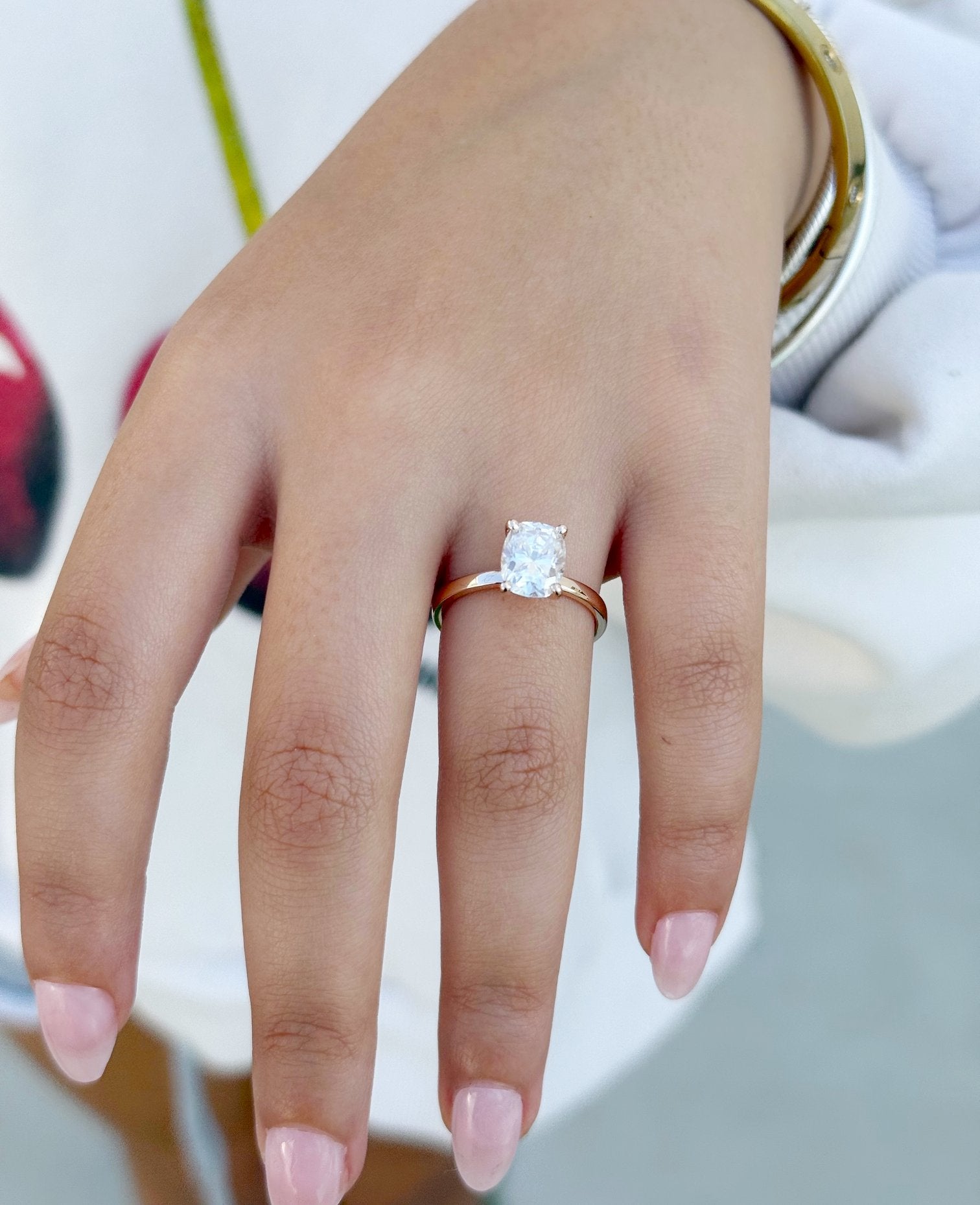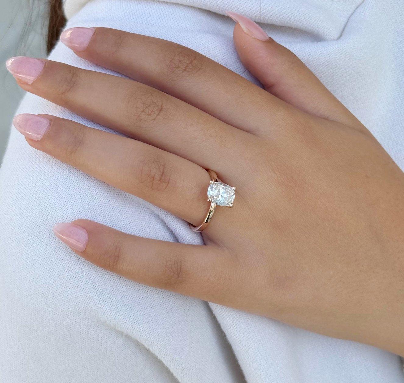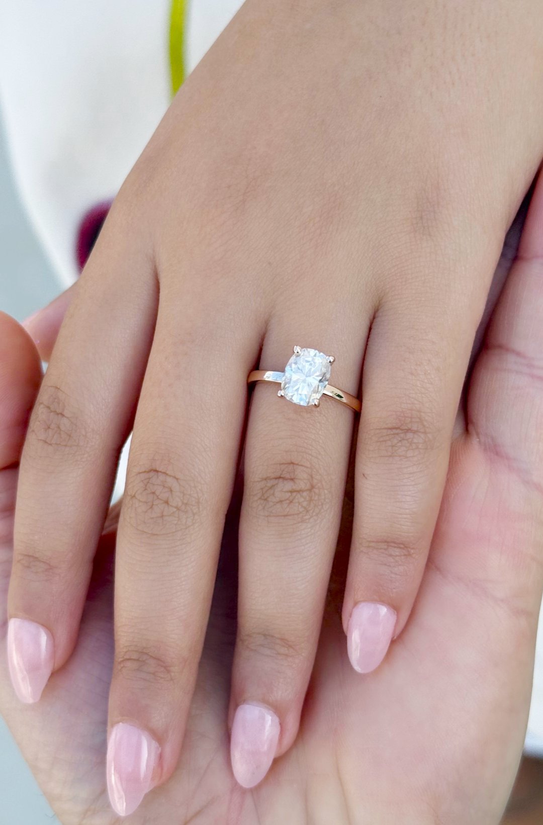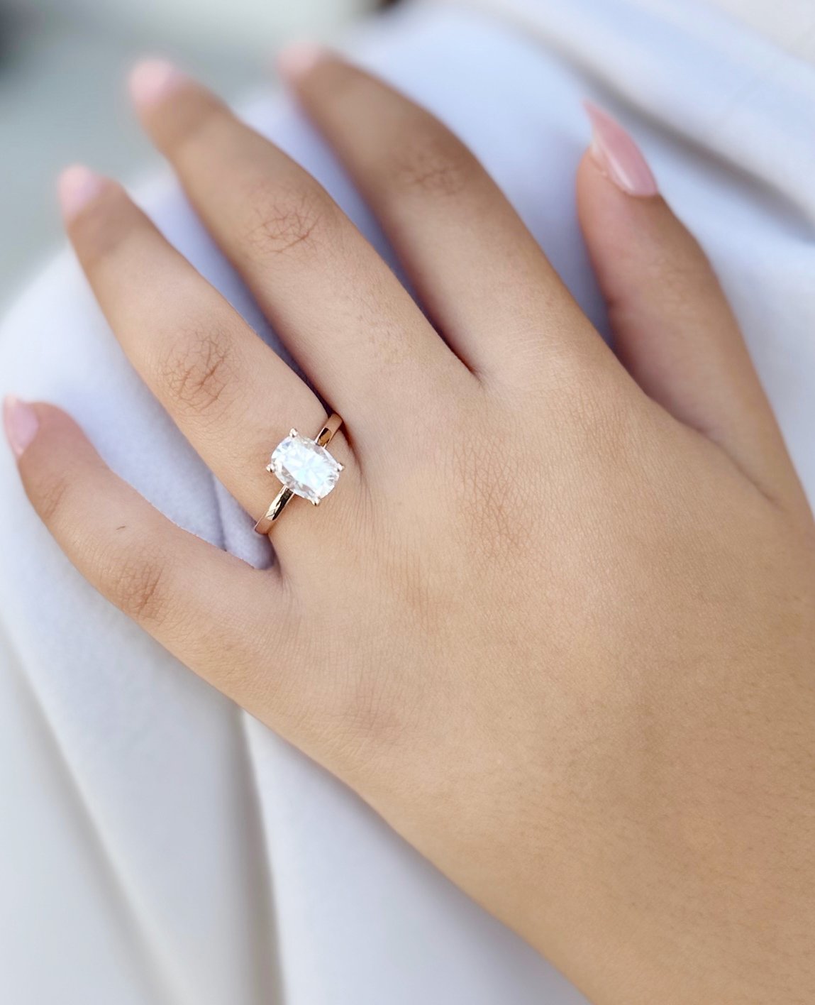Crafted from 14K solid rose gold, this engagement ring exudes warmth and romance, perfectly complementing the radiant moissanite. The minimalist design allows the beauty of the center stone to take center stage, making it an ideal choice for brides who appreciate simplicity with a touch of luxury. The smooth, polished band adds to the ring's refined aesthetic, ensuring a comfortable fit for everyday wear.