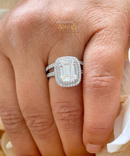 14k solid white gold emerald cut moissanite and round cut natural diamond engagement ring and band double halo bridal set 2.75ct
