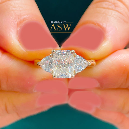 Large 14k Solid Yellow Gold Radiant and Triangle Cut Forever One Moissanite Engagement Ring, Bridal, Wedding Deco Three Stone Style 3.30ctw