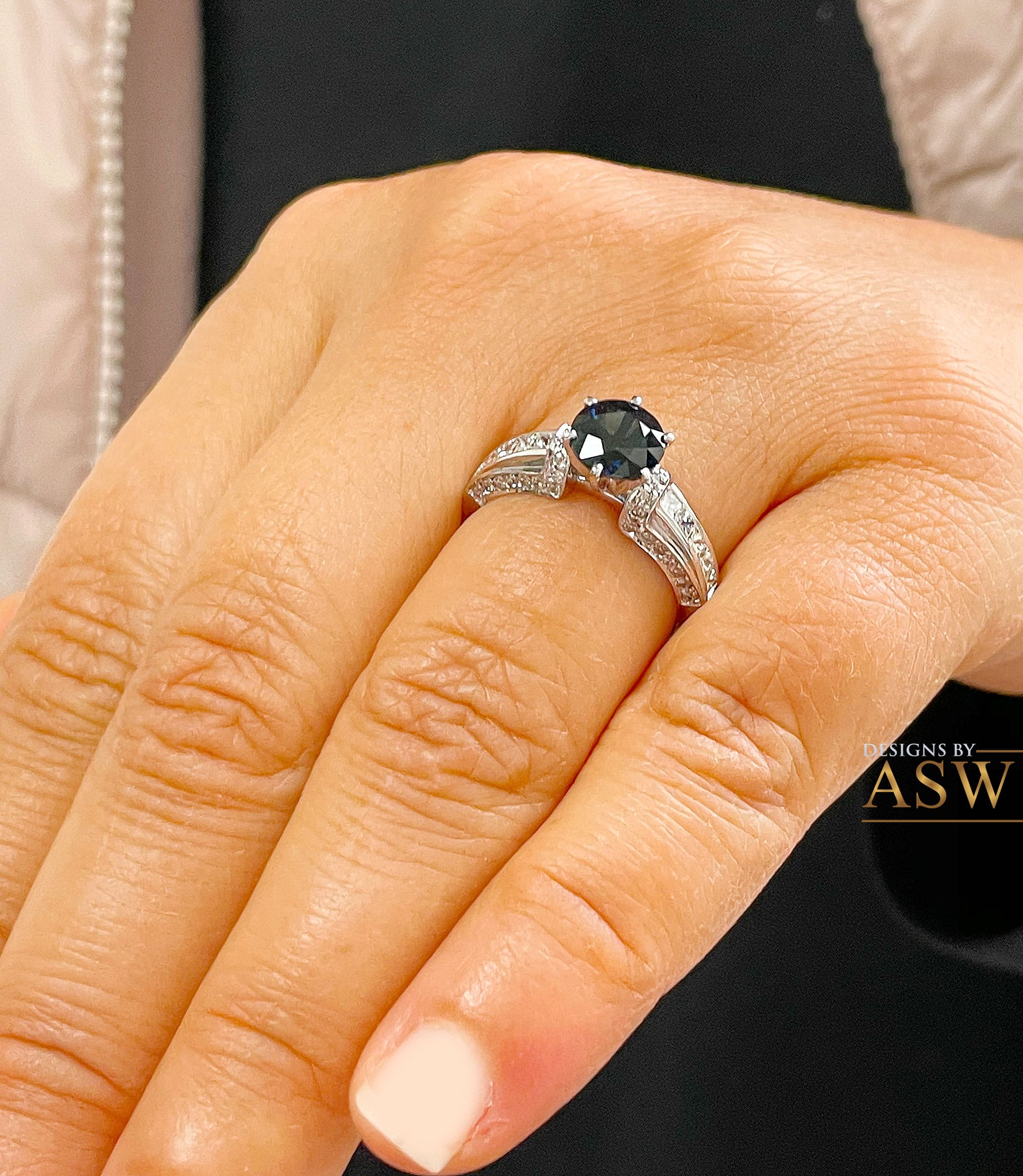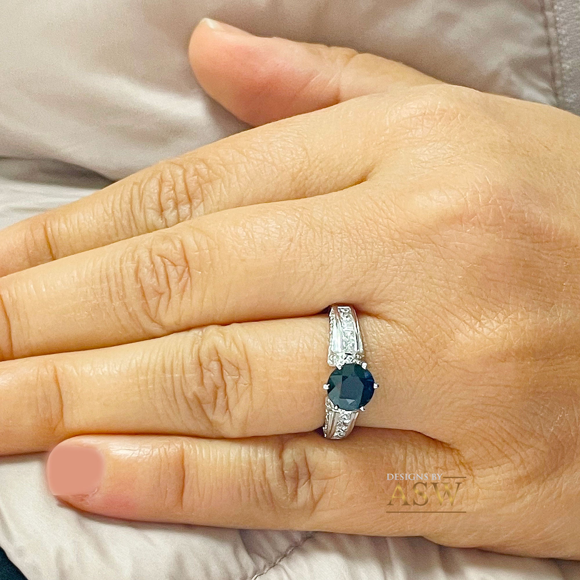 A gorgeous design with a stunning oval cut blue sapphire set in a beautiful filigree design, this ring definitely catches the eye!