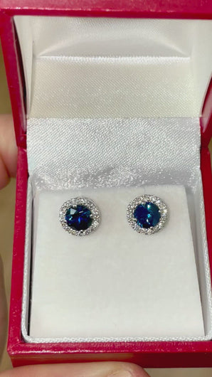 14K Solid White Gold Round Cut Simulated Sapphire And Diamonds Stud Earrings Prong Set Halo Style, Bridal, Anniversary, Gift 2.00ctw