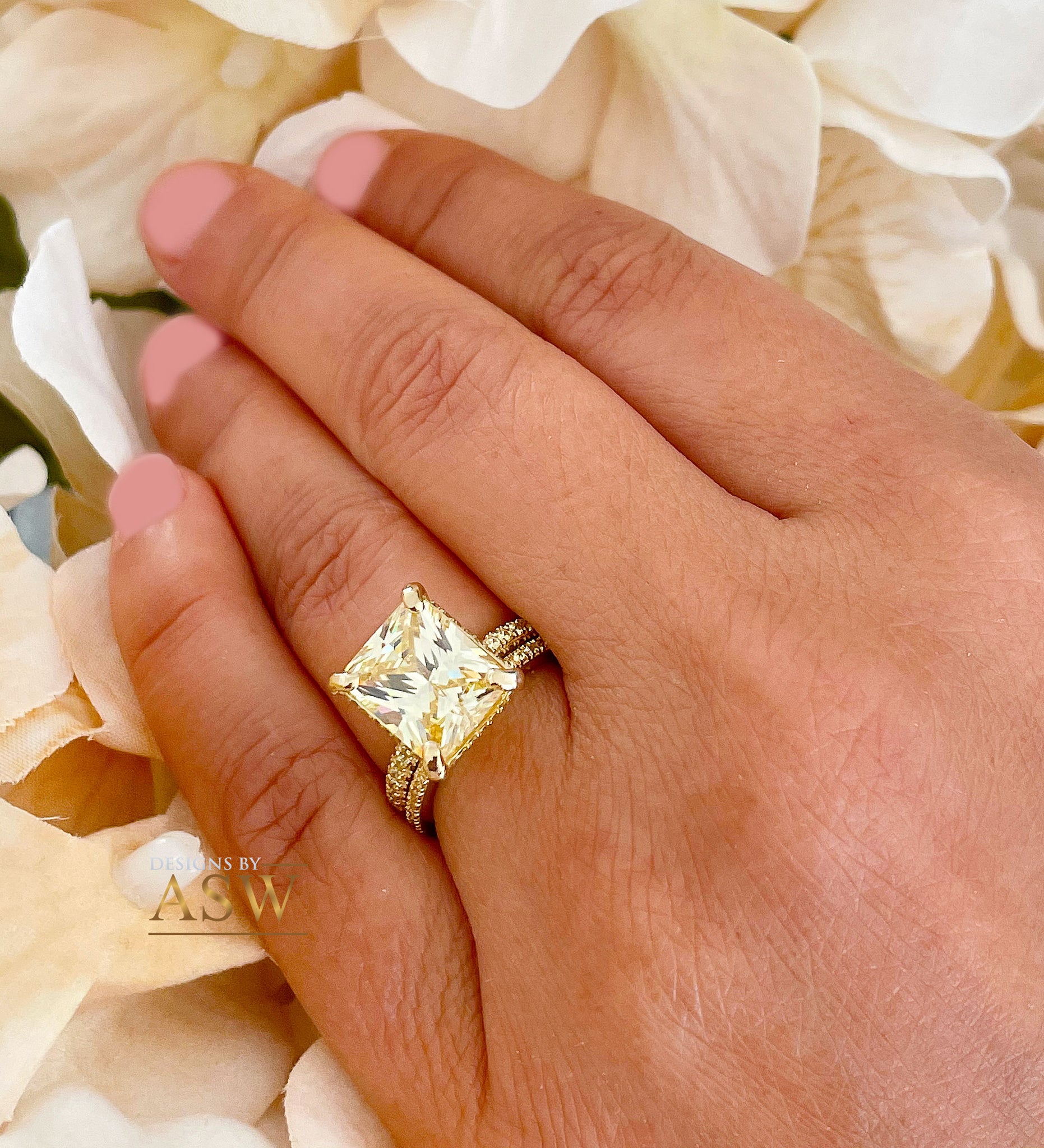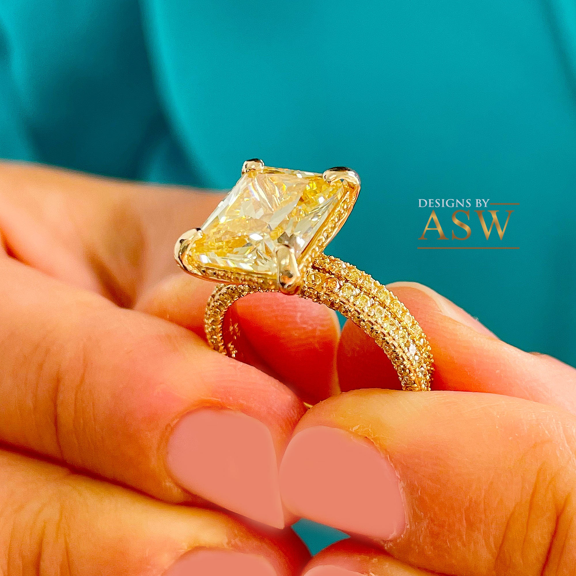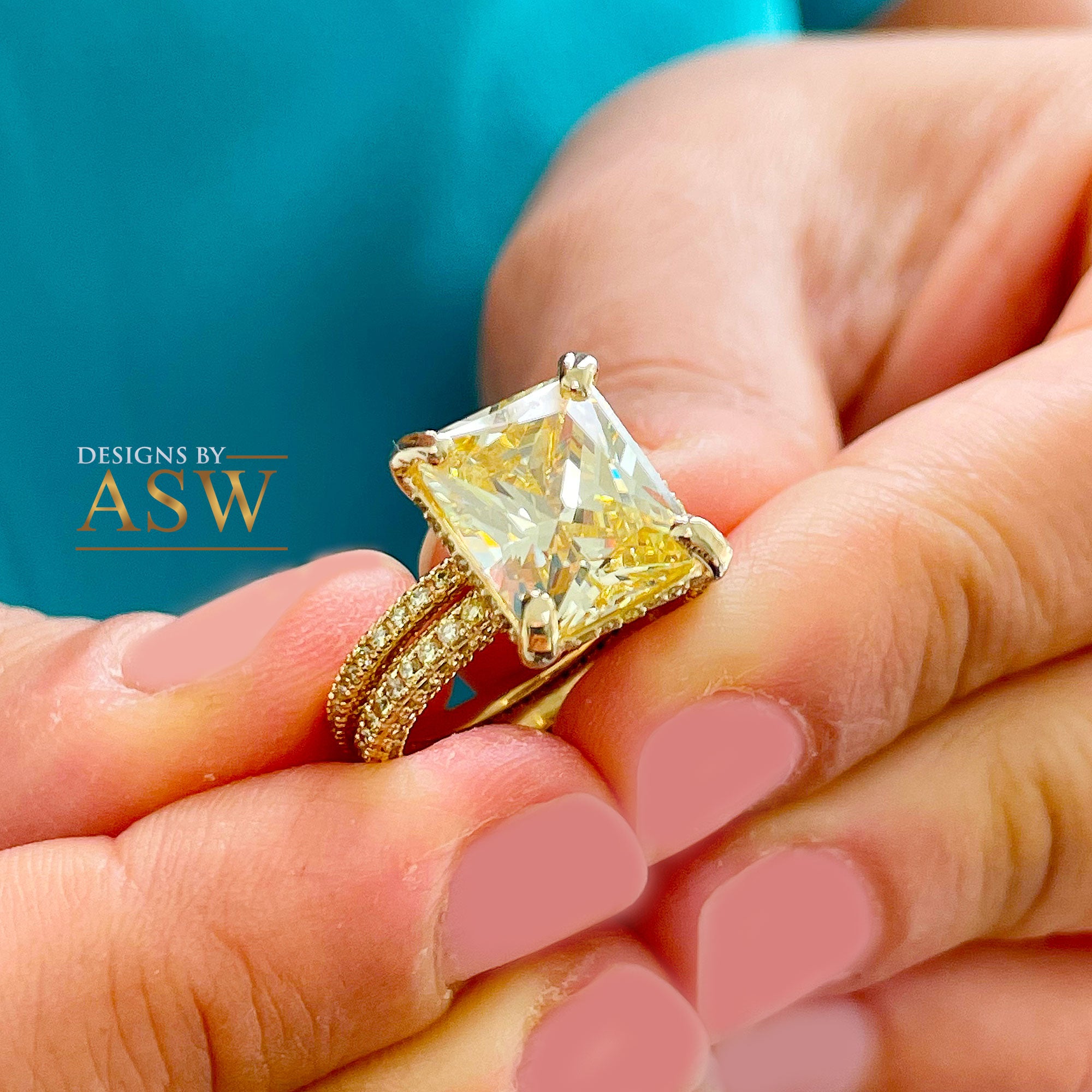 A stunning design, a yellow gold and fancy yellow diamonds featuring a large 3.00ct perfectly cut fancy yellow radiant diamonds set in a halo design ring and band set!