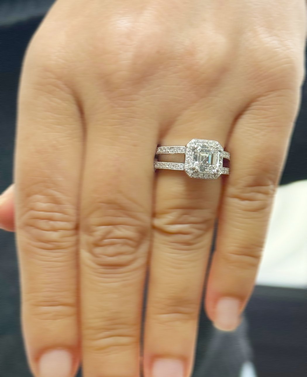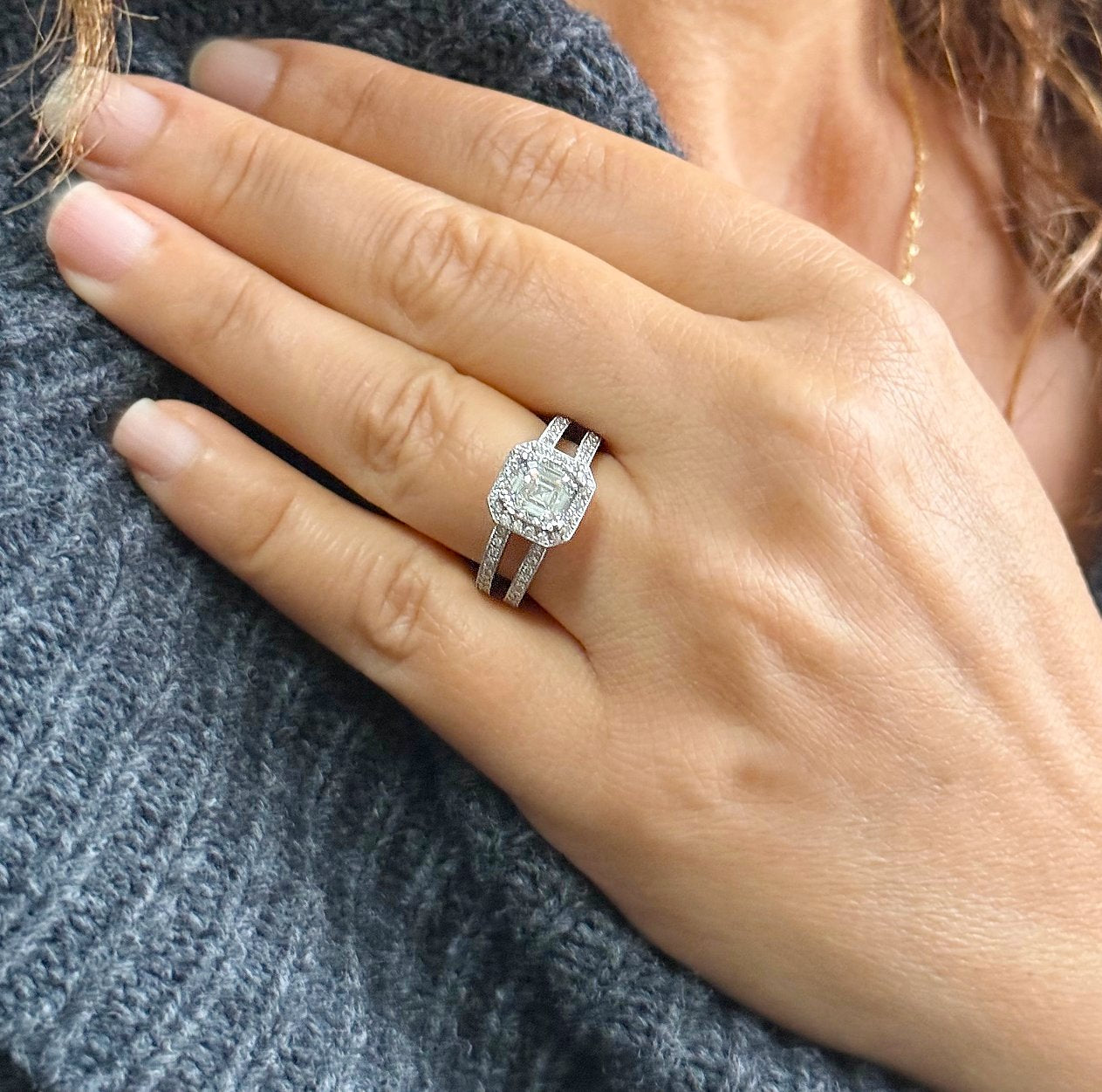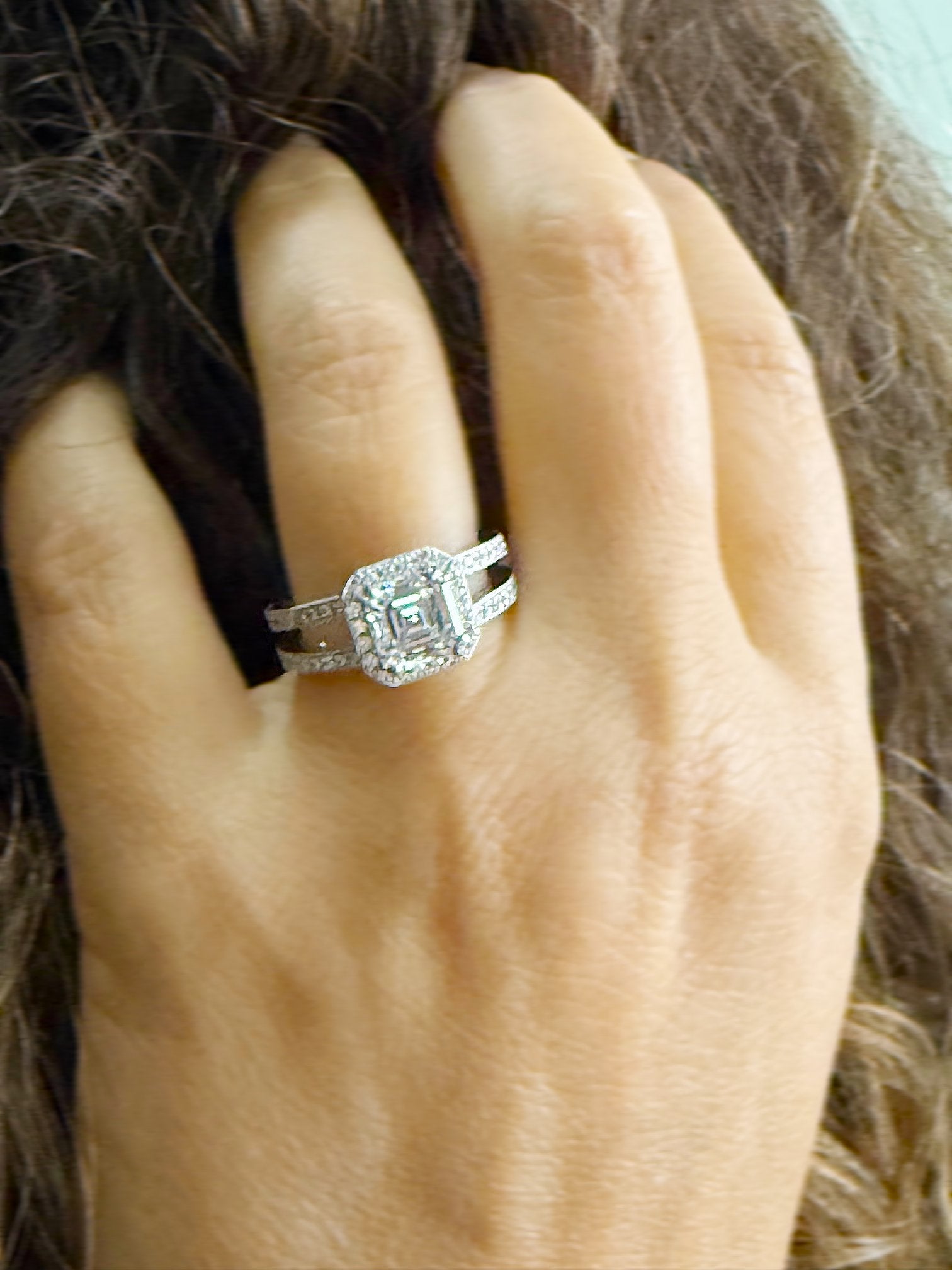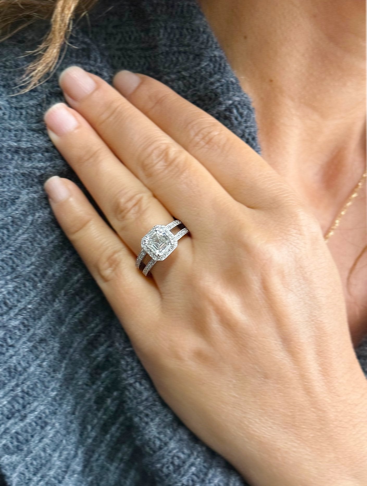 The sophisticated split shank design adds both dimension and modern flair, creating an eye-catching silhouette that enhances the overall shine of the ring. Round side stones are meticulously placed to complement the geometric beauty of the Asscher center, providing a seamless blend of vintage charm and contemporary style. The inner halo adds a hidden layer of sparkle, offering a unique and radiant finishing touch.