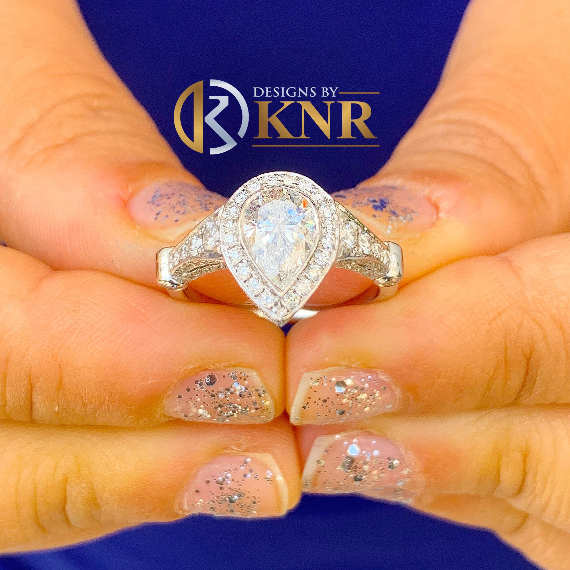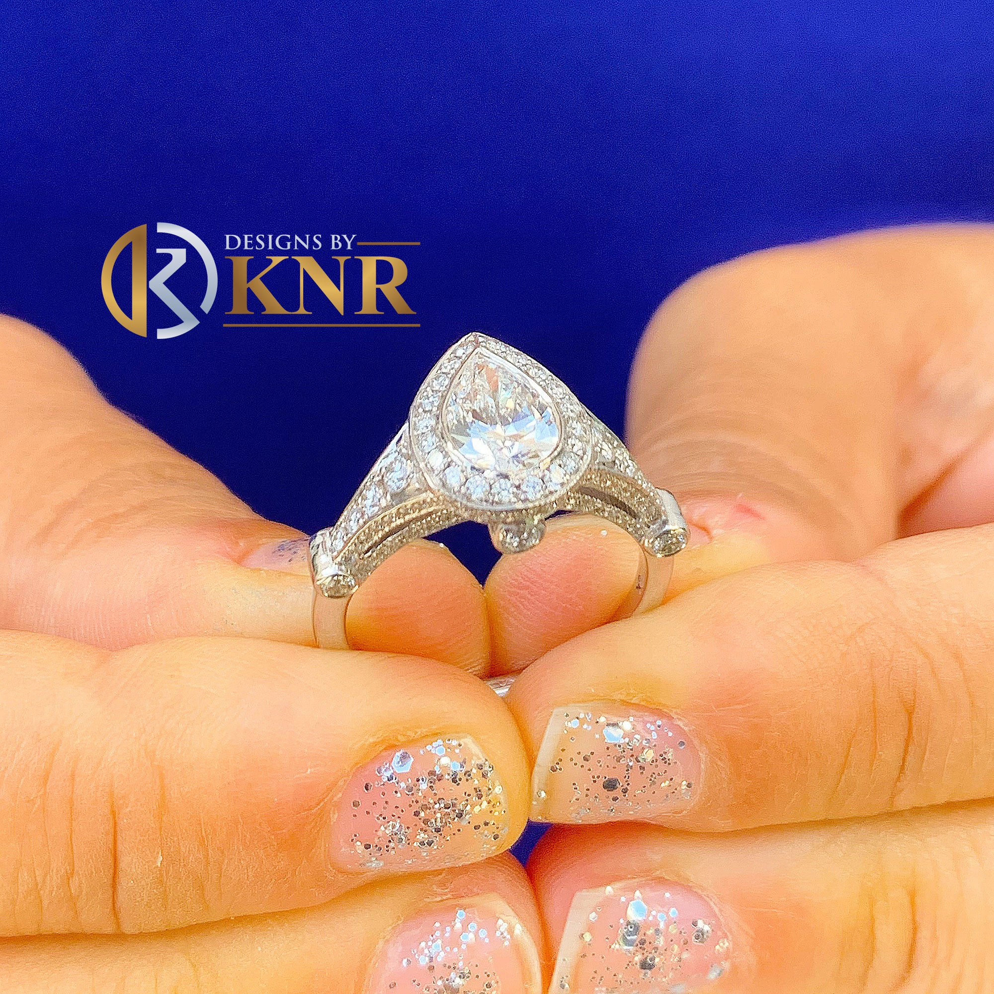 An stunning design with filigree work all around, a beautiful creation showcasing a perfectly cut 2.00ct center pear shape halo surrounded with beautiful and sparkly round cut diamonds and design all around the ring with beautiful antique style filigree etching!