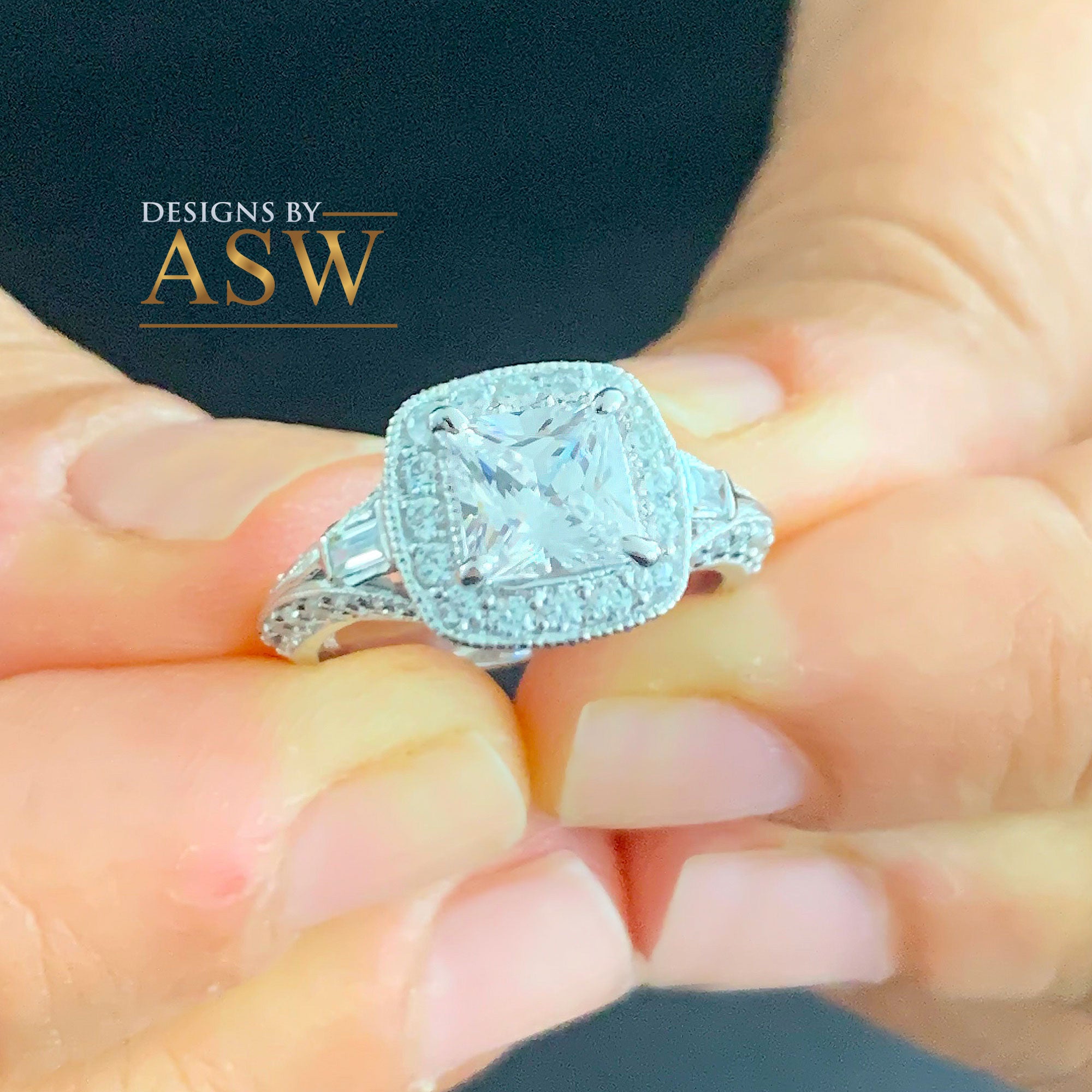 An elegant design with filigree work all around, a beautiful creation showcasing a perfectly cut 1.20ct center princess cut halo surrounded with beautiful and sparkly round and baguettes cut diamonds!