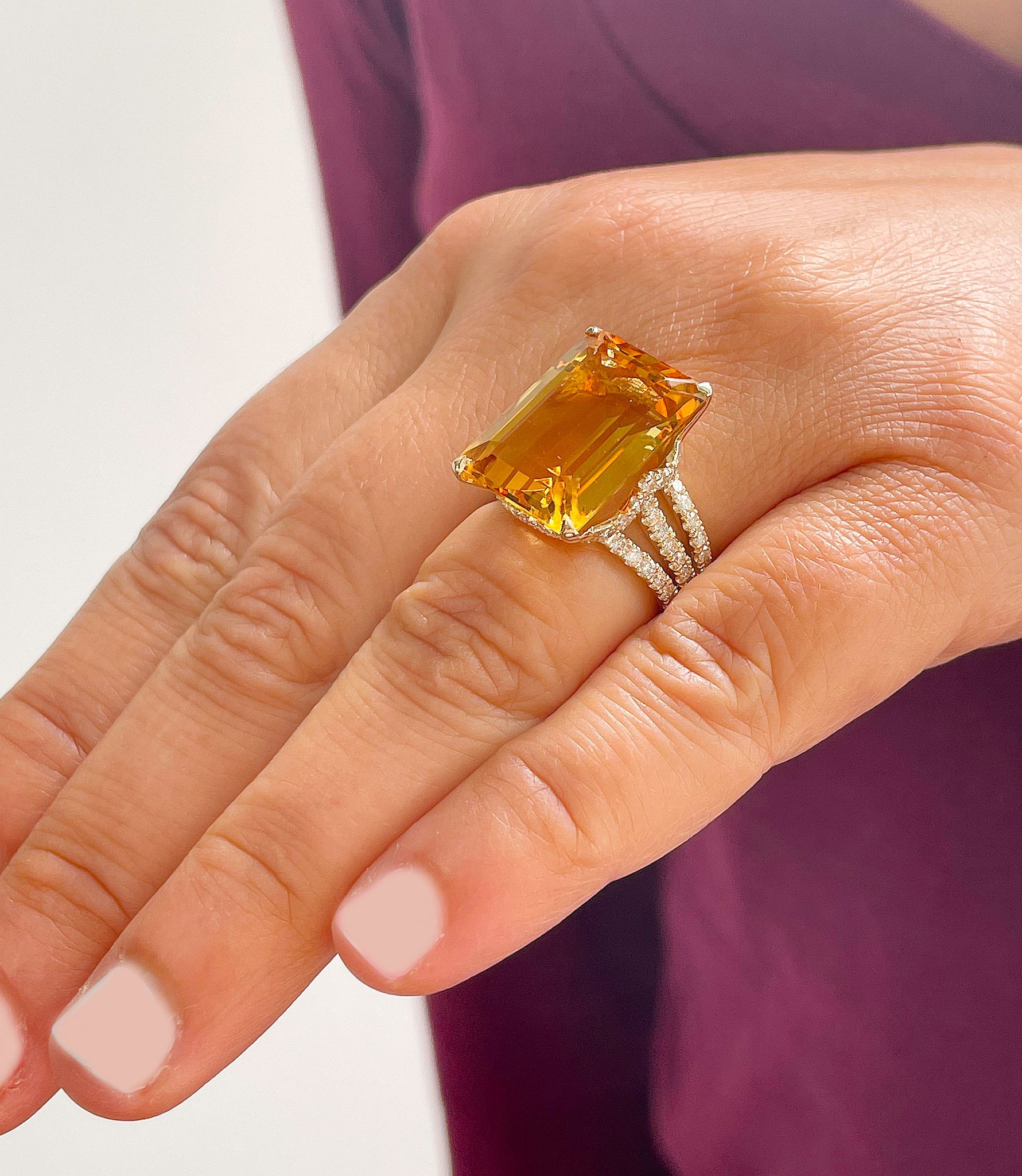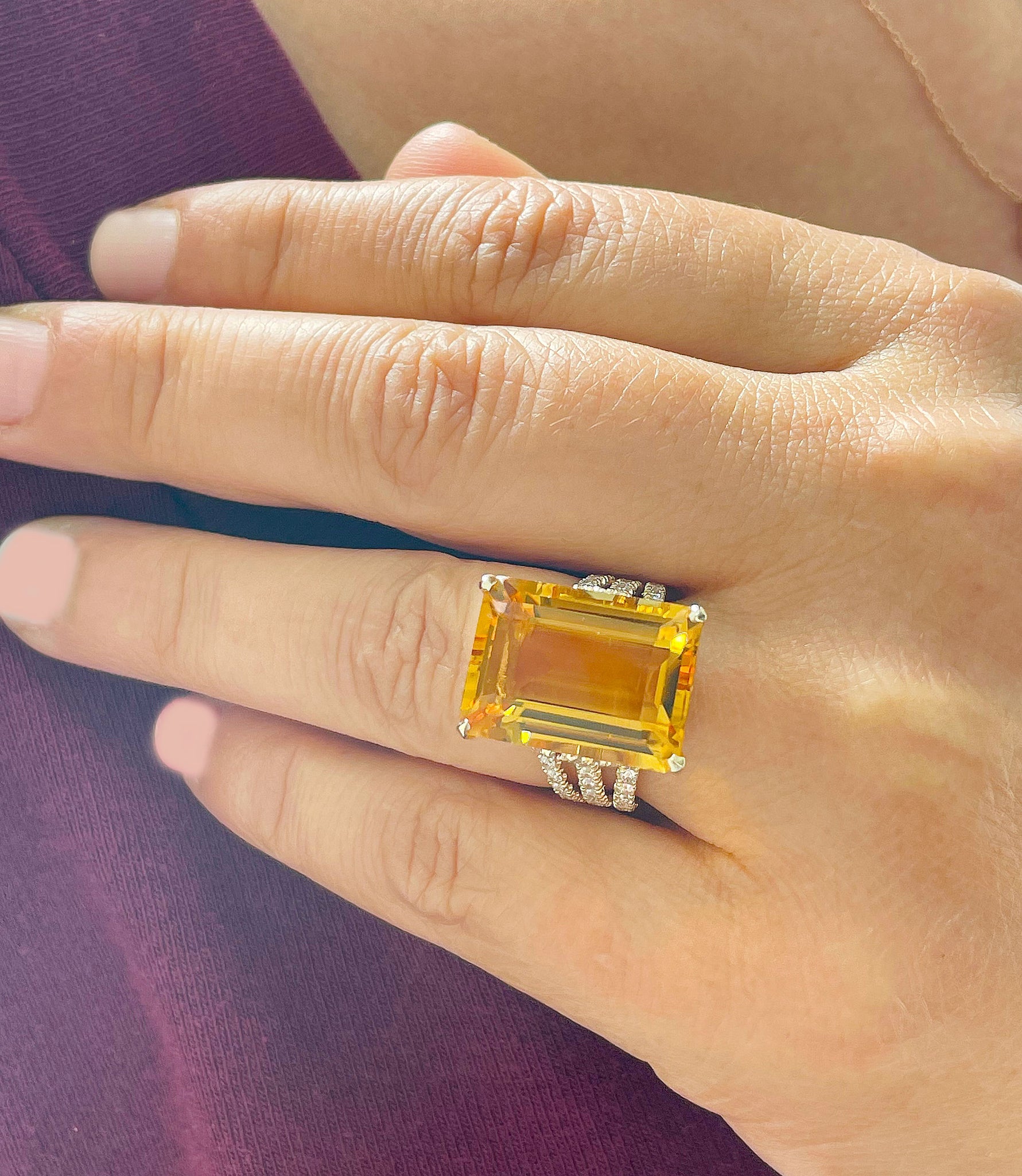 A gorgeous design with a stunning and cushion cut yellow citrine set in a beautiful halo split shank design, this ring definitely catches the eye!